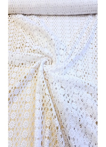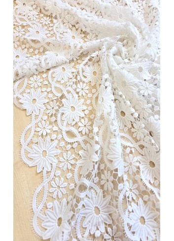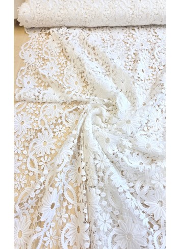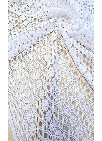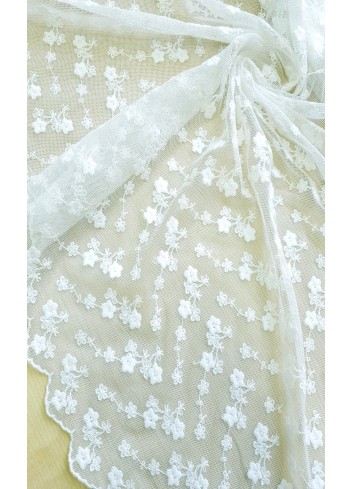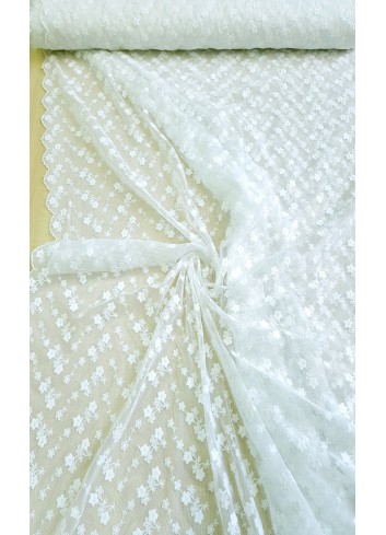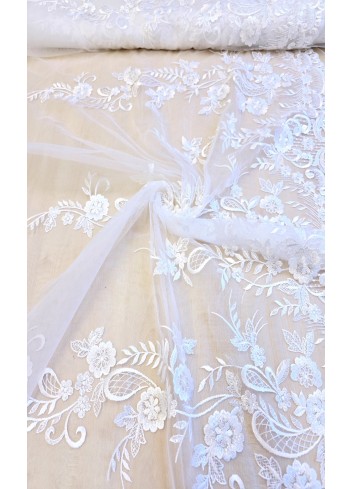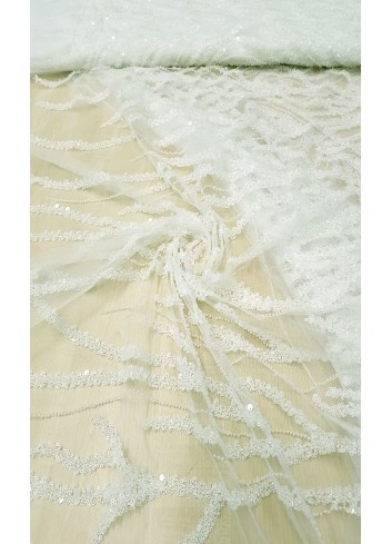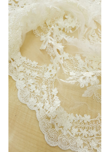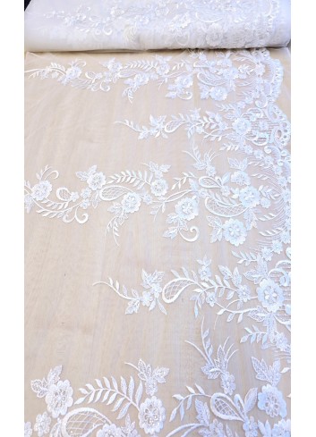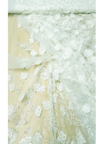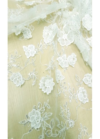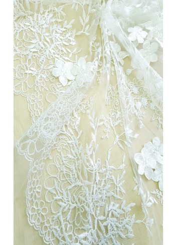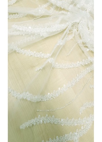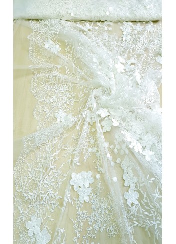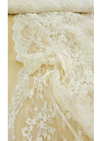 Luxusní portugalská svatební krajka v ivory barvě, vyšívaná celoplošně drobnými romantickými lístky, zdobena decentně průsvitnými pajetkami, velký podíl přírodního materiálu způsobuje, že je příjemná na dotek. Velice efektní svatební krajka, splývavá a mírně elastická. Super šíře 3m! Made in Portugal.
