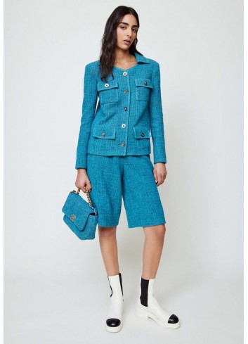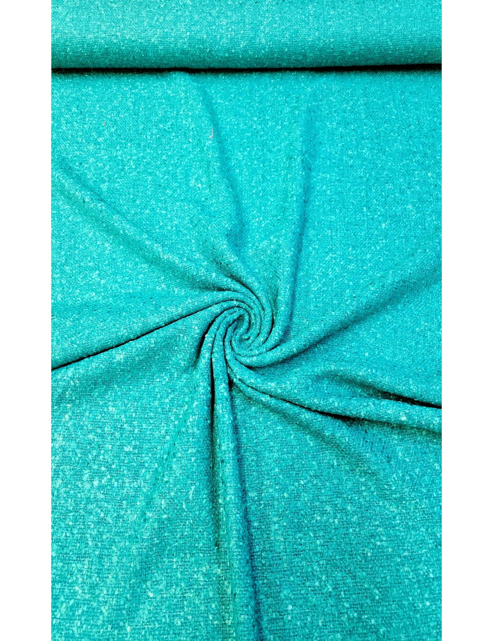 Italská tvídová luxusní látka typu chanel v krásné tyrkysové barvě, střední gramáže, příjemná na dotek, poddajná. Vyrobeno v Itálii z přírodních vláken. Velice elegantní.