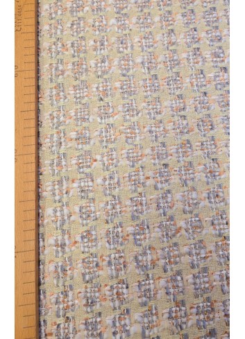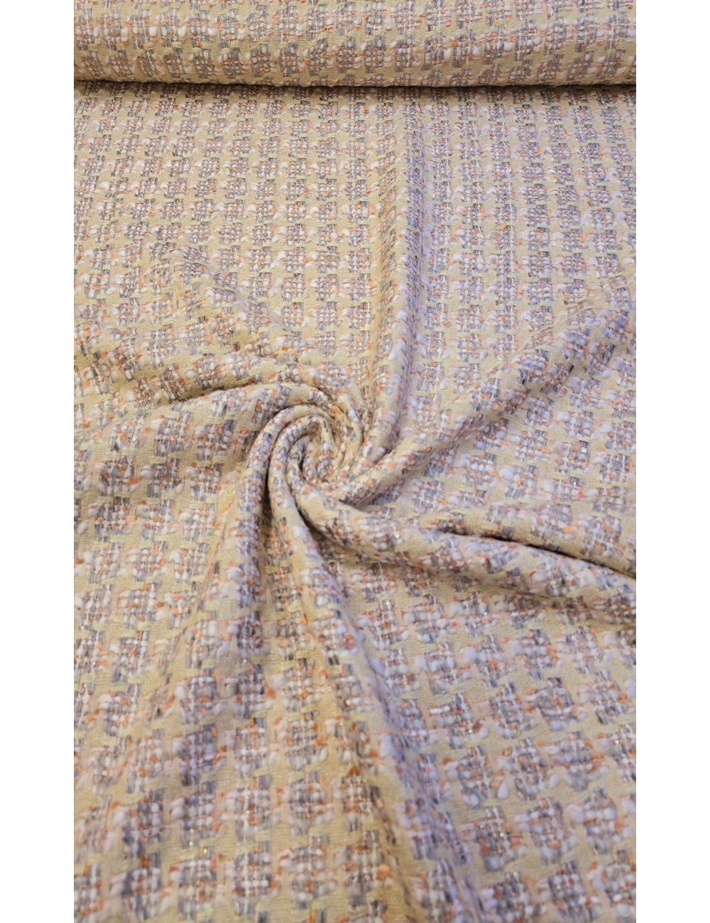 Italská tvídová látka typu chanel, střední gramáže v krásném provedení z přírodních vláken v šedo - ivory - lsosovém tkaní na béžovém základě s jemně vetkanou zlatou nití. Příjemná na dotek a měkká, velice elegantní provedení. Vyrobeno v Itálii.