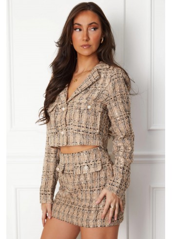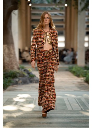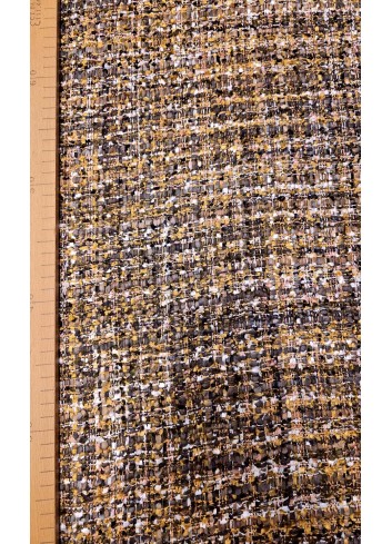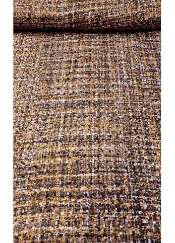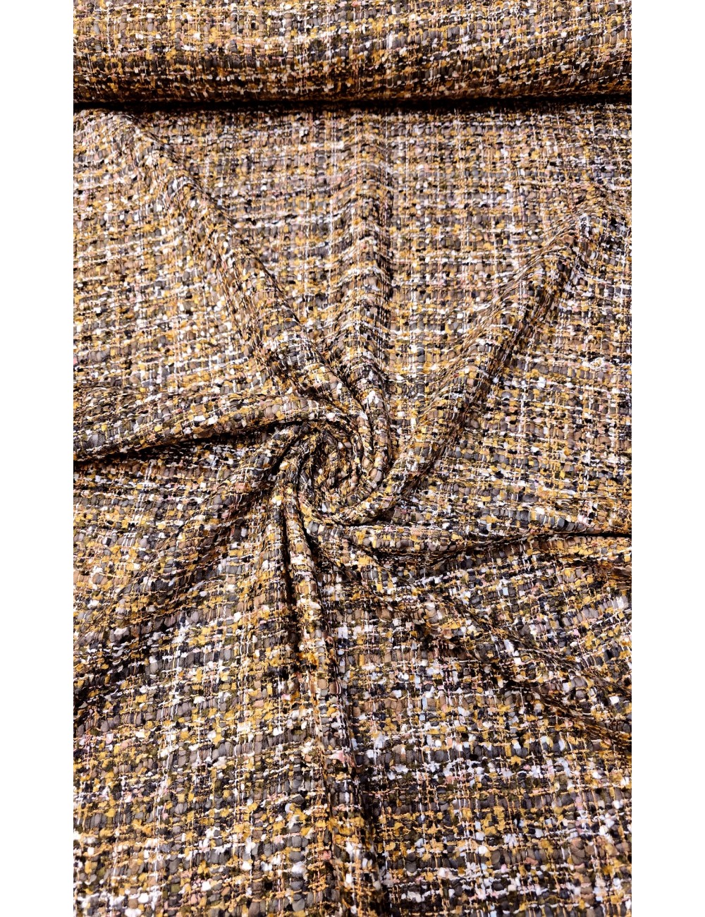 Italská tvídová látka typu chanel, střední gramáže v krásném provedení z přírodních vláken v barevném provedení v zemito hnědých odstínech.  Příjemná na dotek a měkká, velice elegantní provedení. Vyrobeno v Itálii.