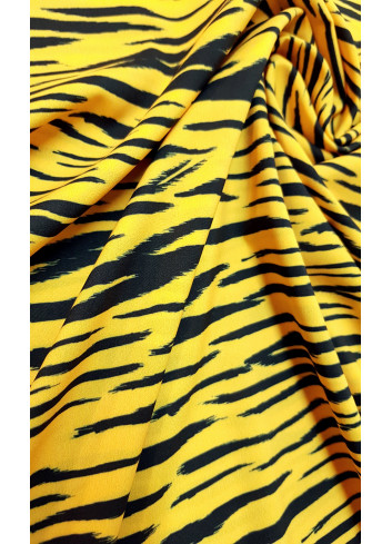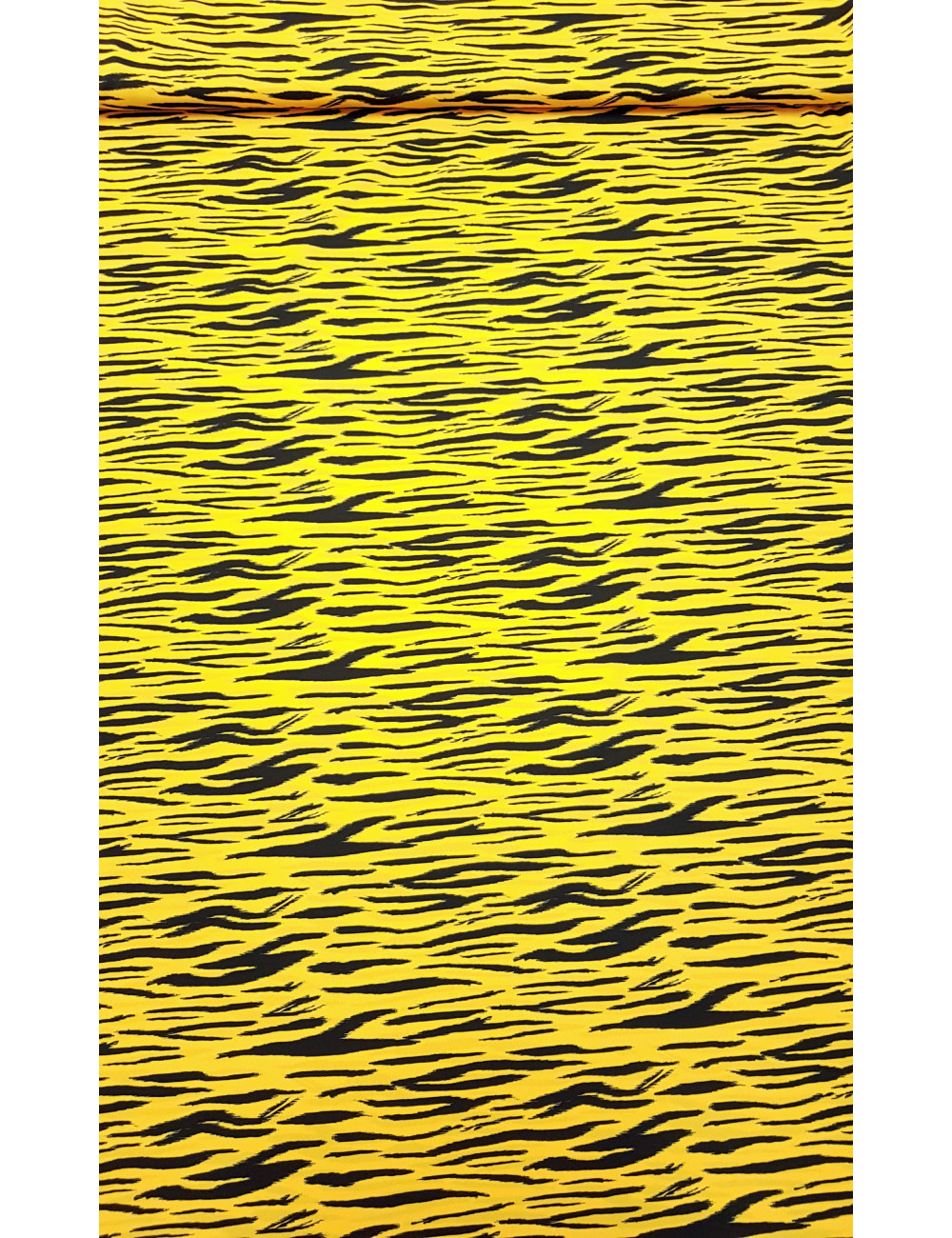 Vzorovaná látka se zvířecím vzorem v žluto černém provedení, elastická na obě strany, lehounká, příjemná, splývavá, téměř neprůsvitná, rychleschnoucí a málo krčivá.