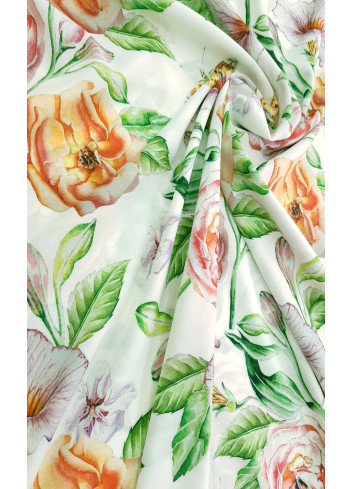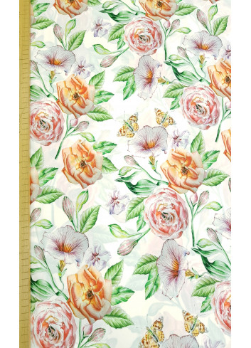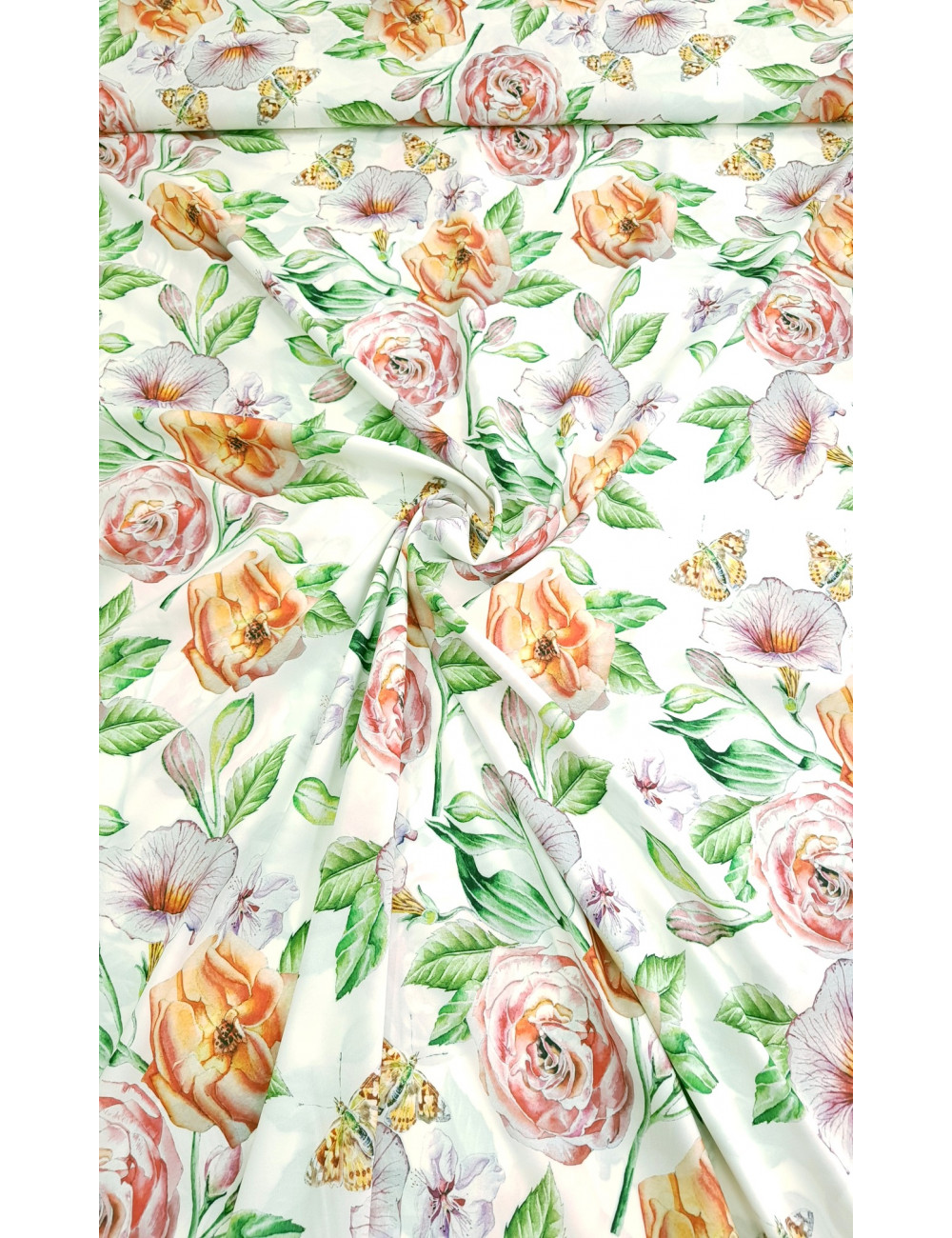 Vzorovaná látka s květinovým vzorem a motýly na bílém podkladu , elastická na obě strany, lehounká, příjemná, splývavá, téměř neprůsvitná, rychleschnoucí a málo krčivá.