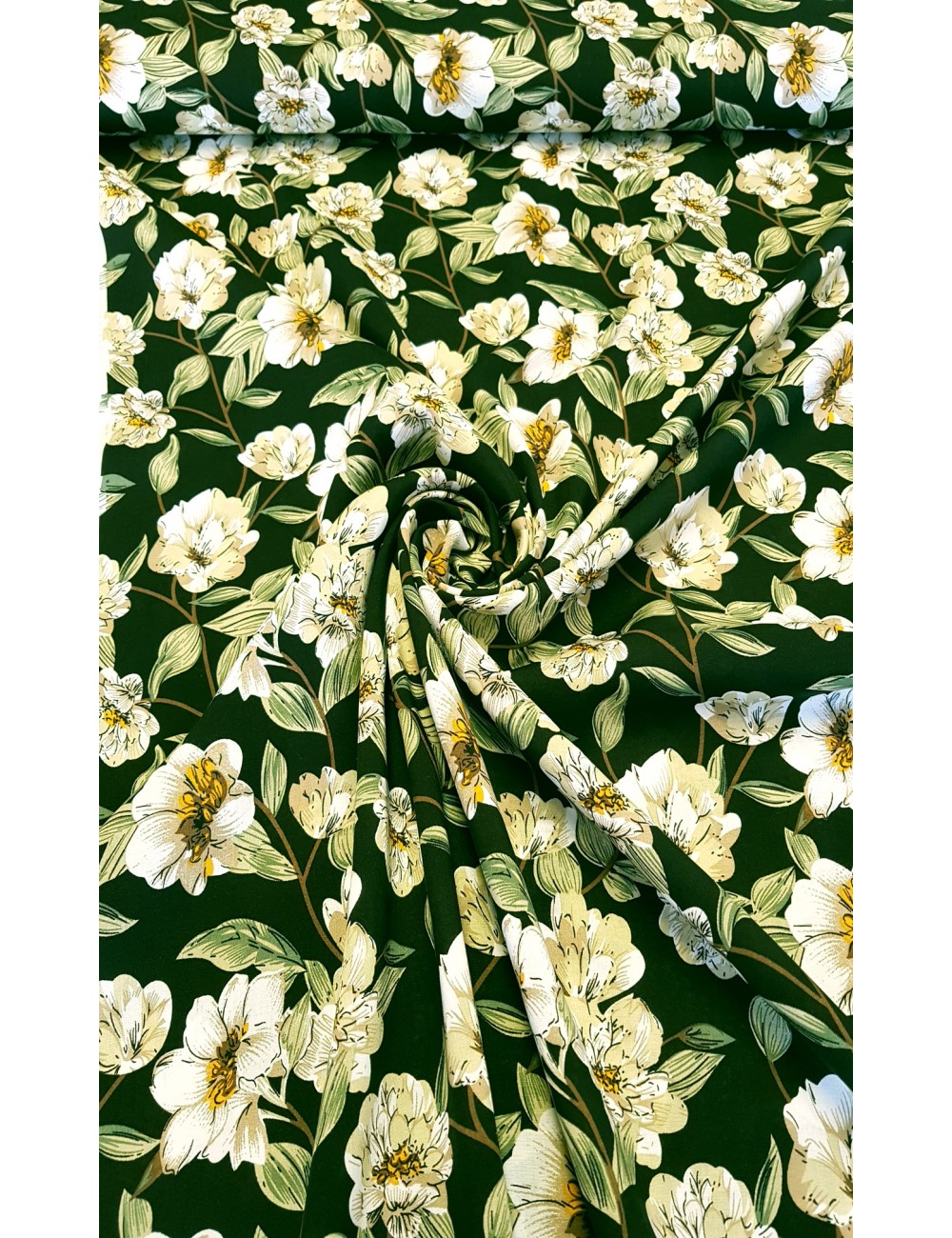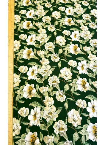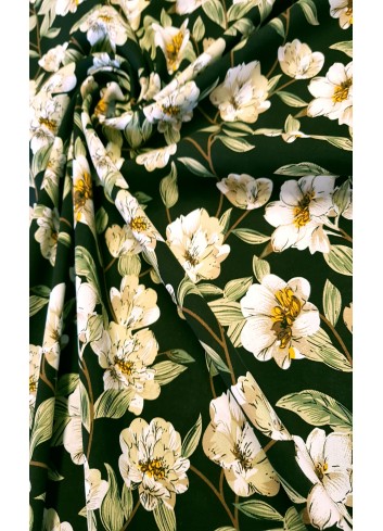 Viskózová látka se vzorem bílých květů na černém základu, příjemná na dotek, vzdušná, mírně elastická.