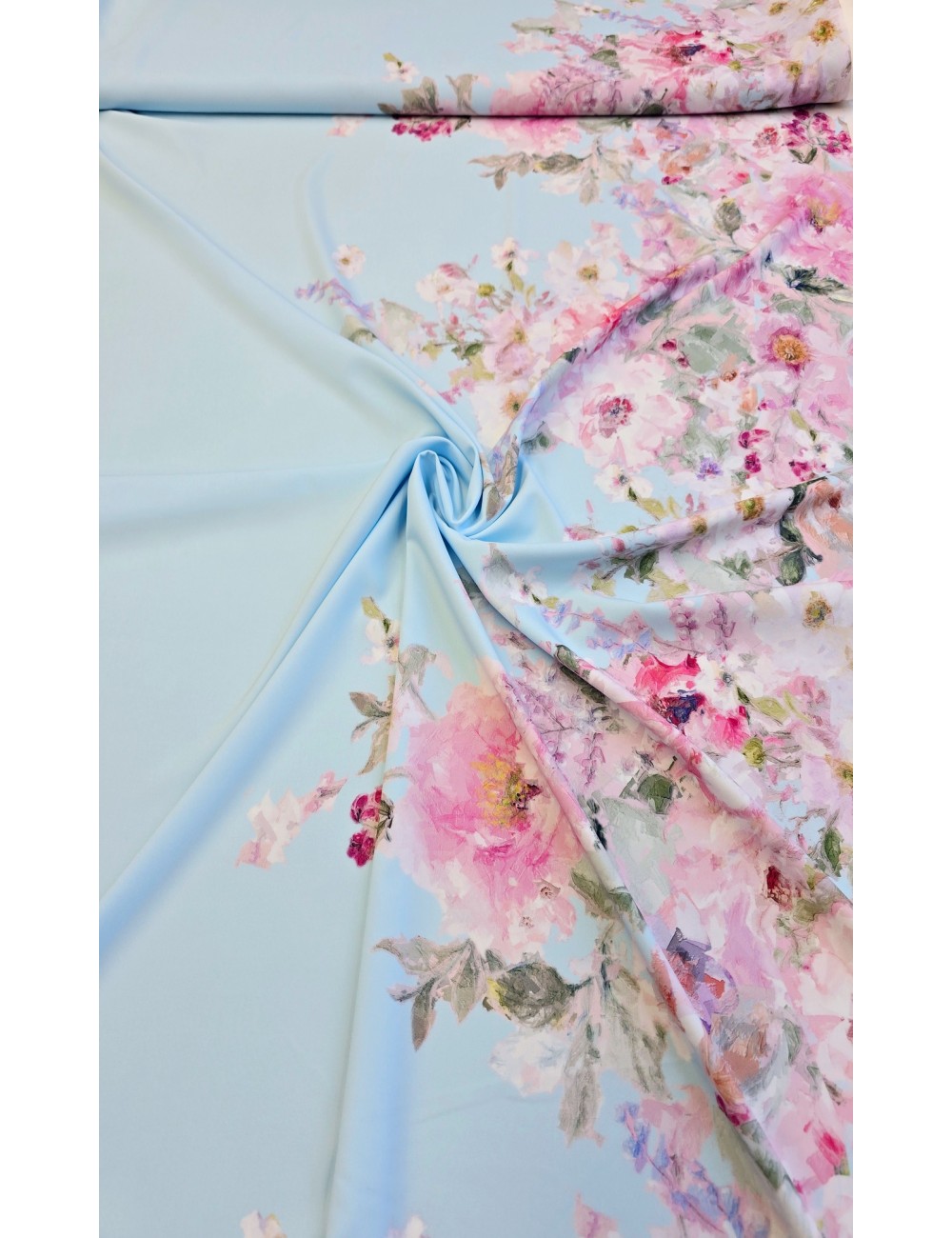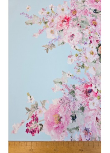 Vzorovaná látka, šatovka s jednostrannou květinovou bordurou o šíři 35 cm na bledě modrém základu, elastická oběma směry, lehounká, příjemná, splývavá, téměř neprůsvitná, rychleschnoucí a málo krčivá.