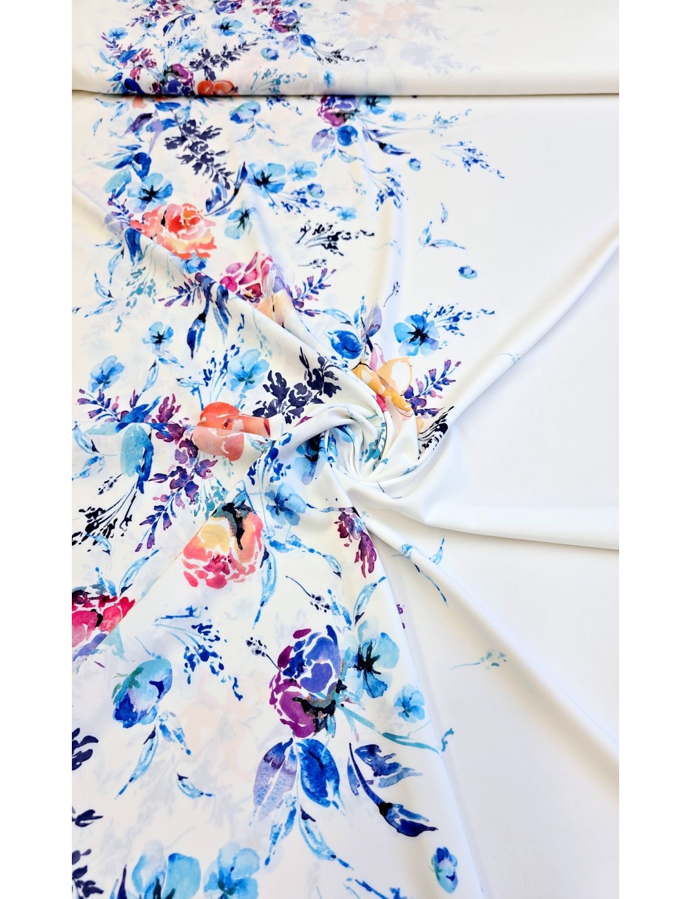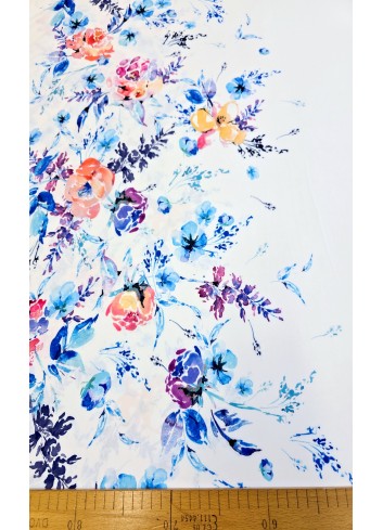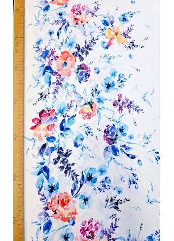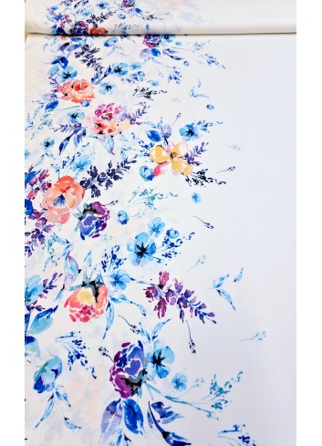 Vzorovaná látka, šatovka s oboustrannou květinovou bordurou o šíři 45 cm na ivory základu, elastická oběma směry, lehounká, příjemná, splývavá, téměř neprůsvitná, rychleschnoucí a málo krčivá.