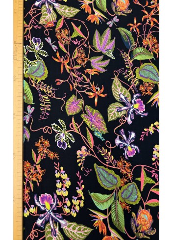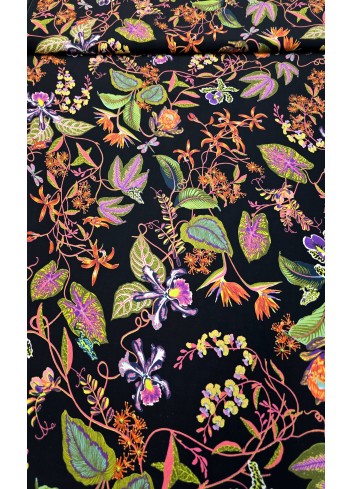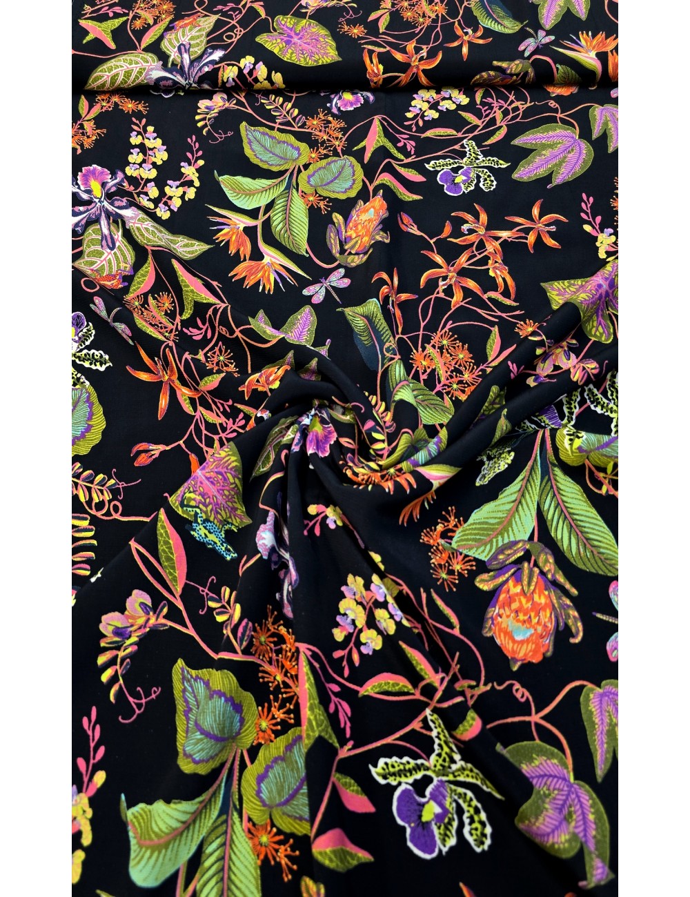 Krásná italská viskóza s barevnými květy, vážkami a žabkami na černém základu, lehoučká, příjemná, elastická a splývavá. Vyrobeno v Itálii, prémiová kvalita.