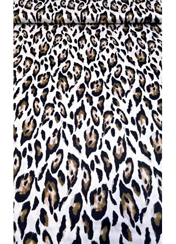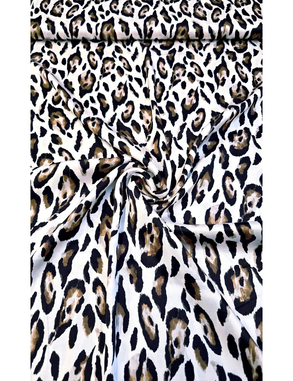 Krásný italský viskózový satén, se zvířecím vzorem na bílém základu, lehoučký, příjemný, elastický a splývavý. Vyrobeno v Itálii, prémiová kvalita.