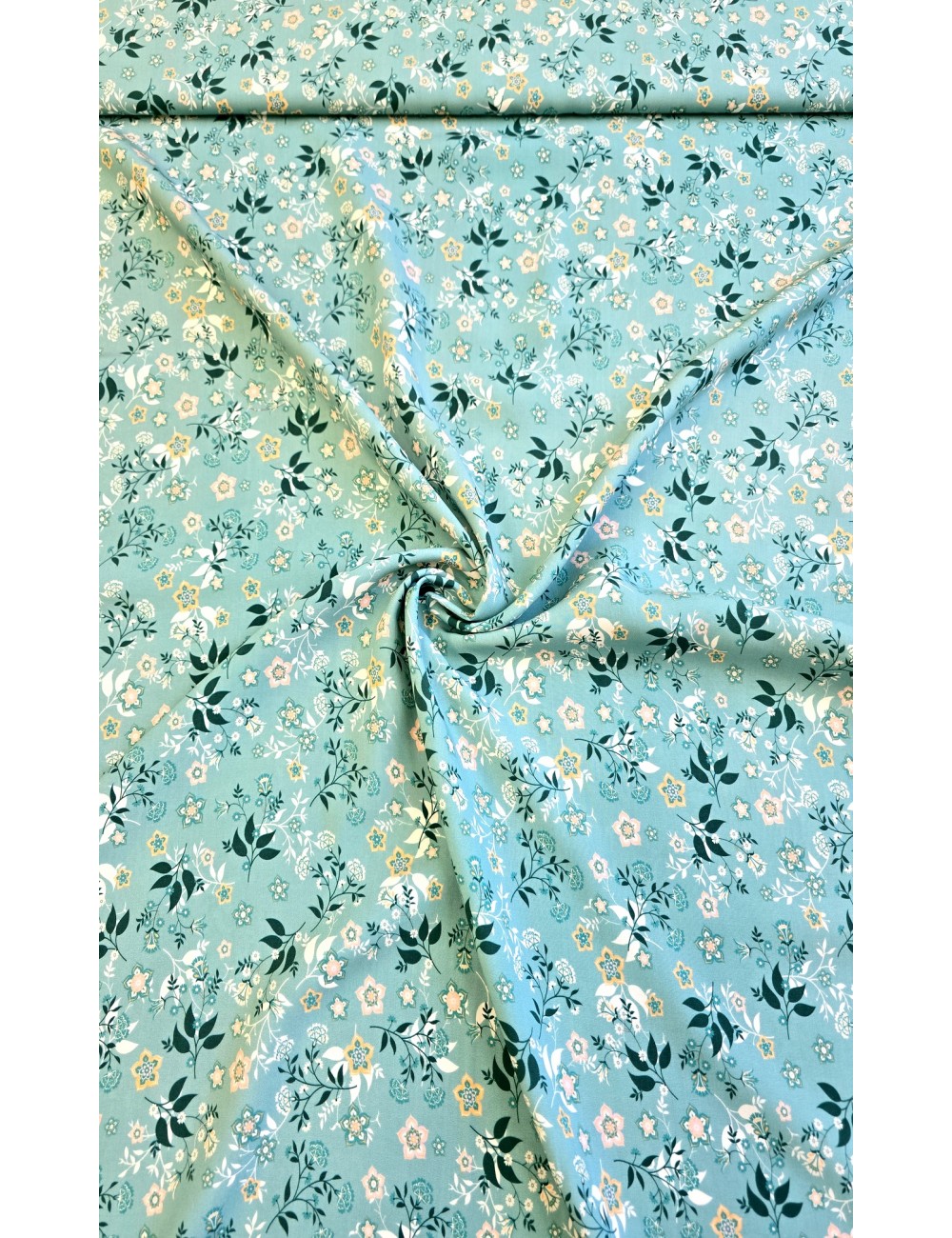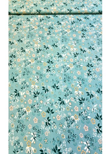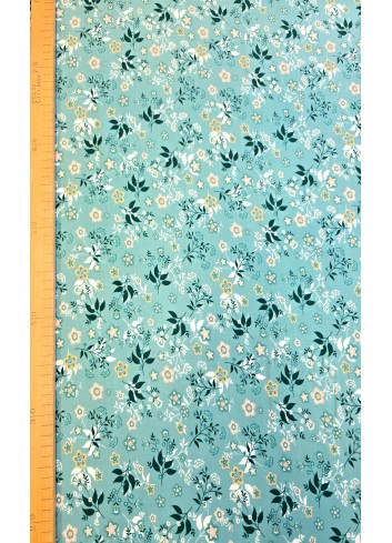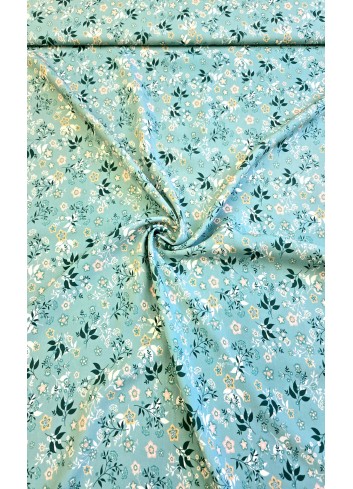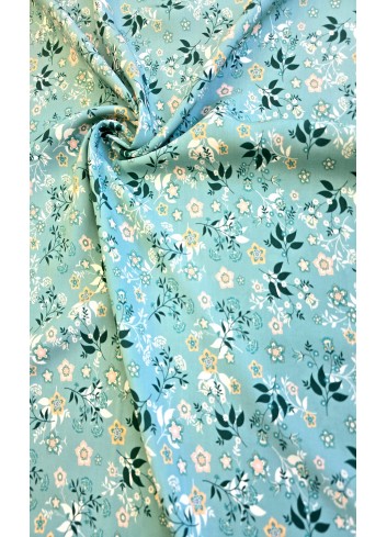 Krásná italská viskóza s drobným květinovým vzorem na tyrkysovém základu, lehoučká, příjemná, elastická a splývavá. Vyrobeno v Itálii, prémiová kvalita.
