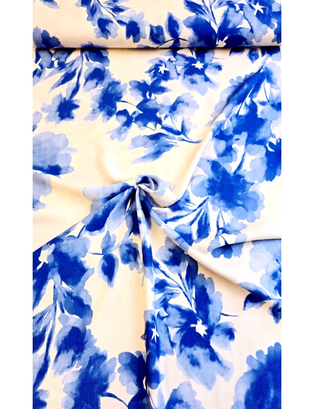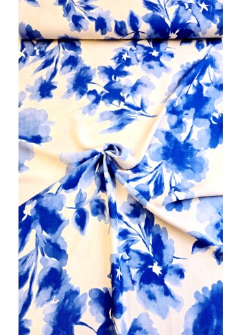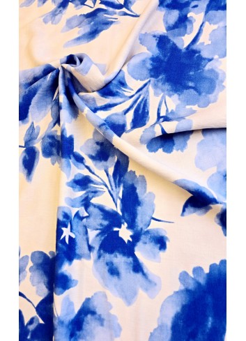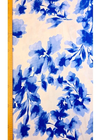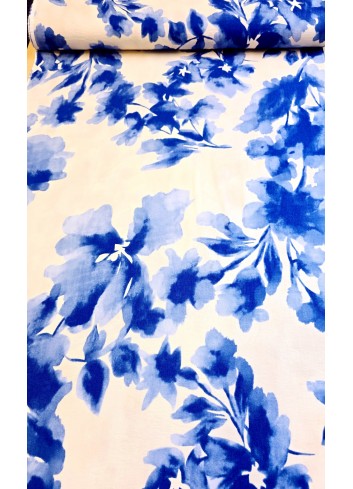 Krešovaná viskózová látka s rozpitými modrými květy na ivory  základu, příjemná na dotek, vzdušná, mírně elastická, minimální krčivost, poctivá gramáž.