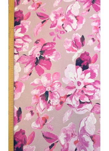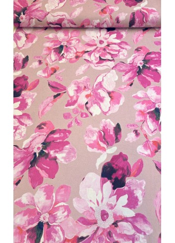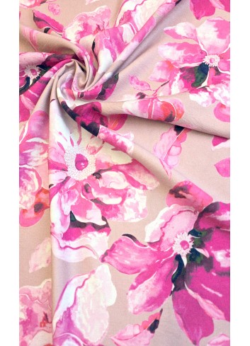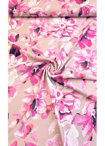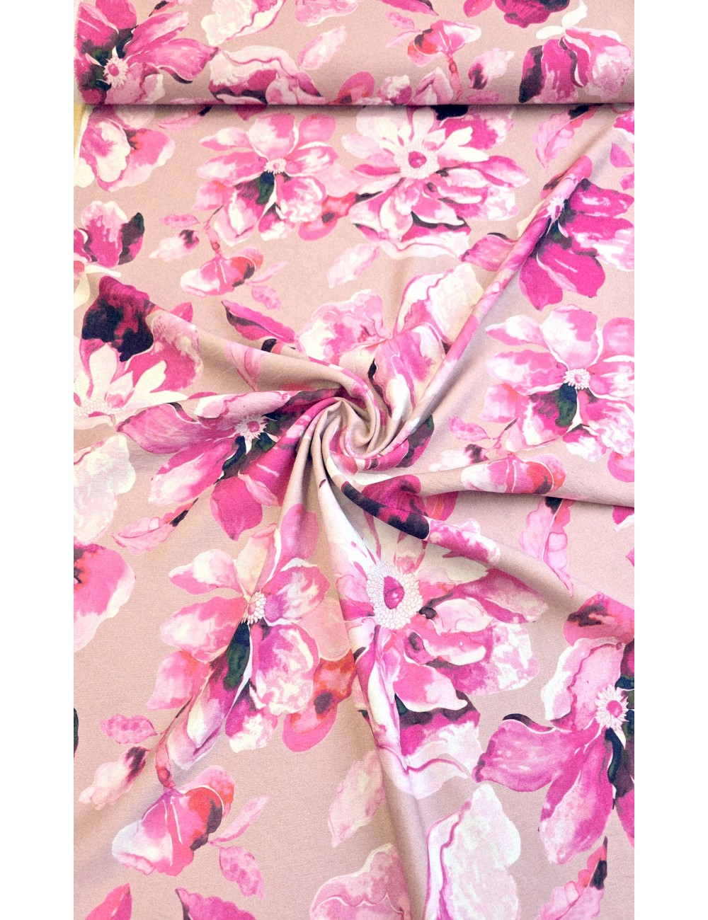 Krešovaná viskózová látka s rozpitými fuchsiovými květy na světle béžovém  základu, příjemná na dotek, vzdušná, mírně elastická, minimální krčivost, poctivá gramáž.