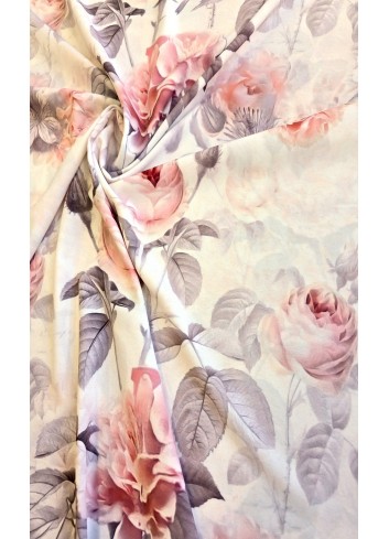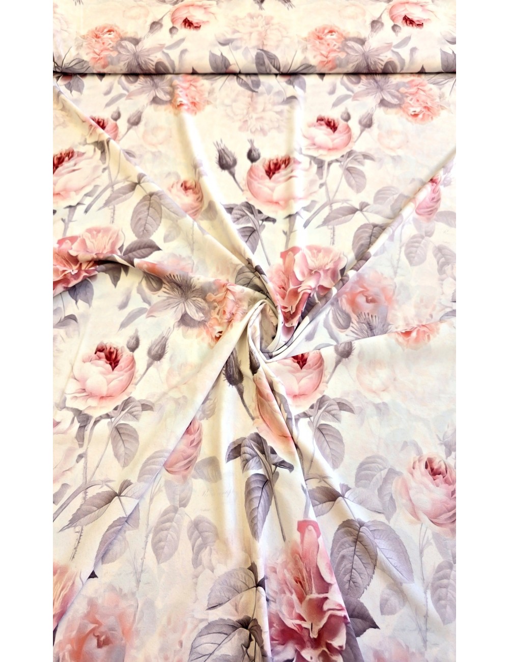 Vzorovaná látka, šatovka s růžemi v pastelových barvách na ivory základu, elastická oběma směry, lehounká, příjemná, splývavá, téměř neprůsvitná, rychleschnoucí a málo krčivá.