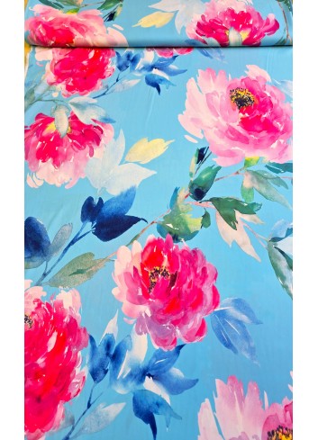 Vzorovaná látka s velkými růžovými květy na modrém základu, elastická oběma směry, lehounká, příjemná, splývavá, téměř neprůsvitná, rychleschnoucí a málo krčivá.