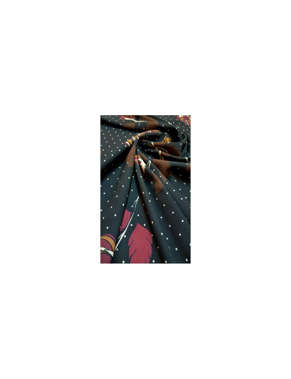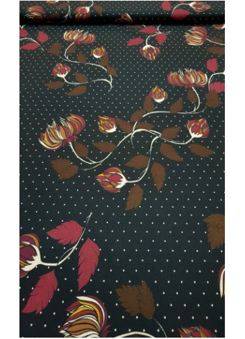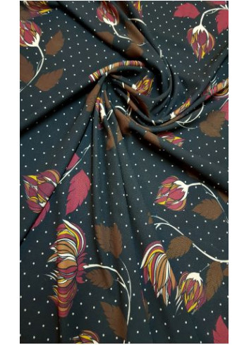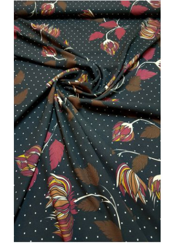 Italská vzorovaná krepová látka s květinovým motivem a drobnými puntíky na grafitovém základu, střední gramáže, příjemná, splývavá, neprůsvitná, mírně elastická.