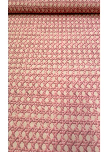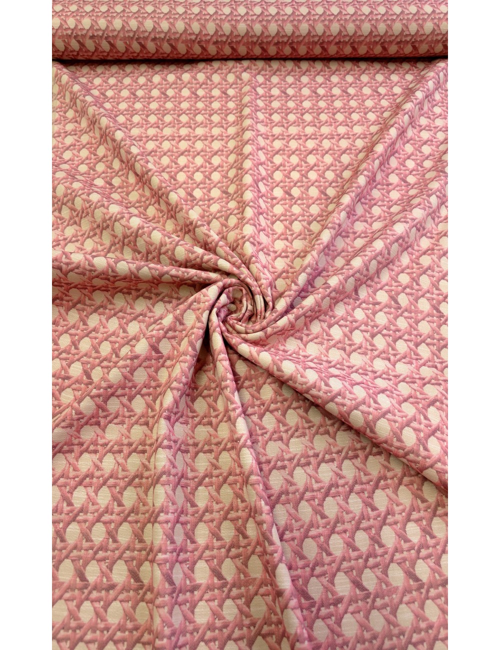 Krásný bavlněný denim z italské produkce. Střední gramáž, italská kvalita, elastický, ikonický vzor cannage v pudrově růžové barvě na přírodním béžovém základu ve stylu módní značky DIOR.