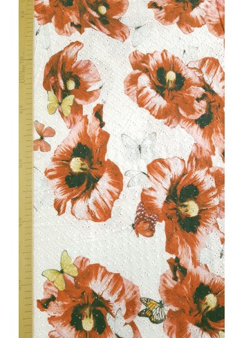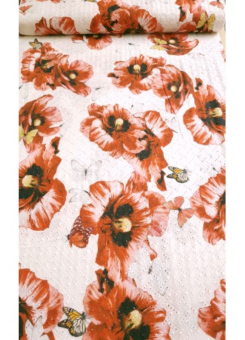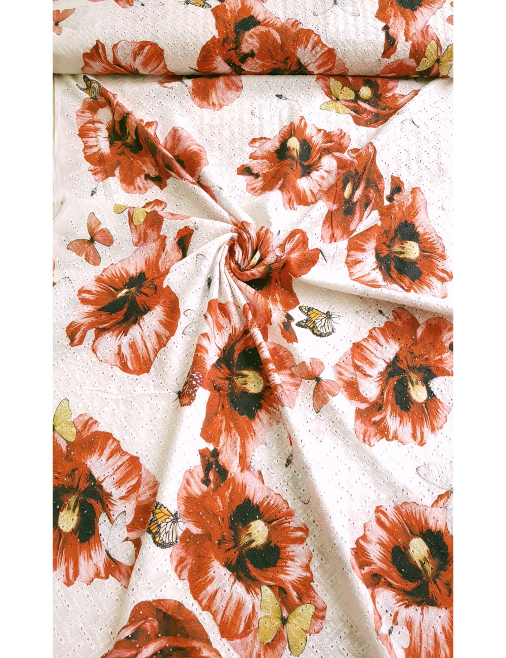 Krásná madeira Sangallo z produkce slavné italské firmy ALTA MODA, dodavatele látek renomovaným módním domům. Lehounká a splývavá, vzor červených vlčích máků s malými motýlky ve stylu módní značky DOLCE&GABBANA. Vyrobeno v Itálii, top kvalita.