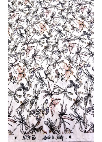 Krásná madeira Sangallo z produkce slavné italské firmy ALTA MODA, dodavatele látek renomovaným módním domům. Lehounká a splývavá, vzor s vážkami a motýlky na bílém základu. Vyrobeno v Itálii, top kvalita.