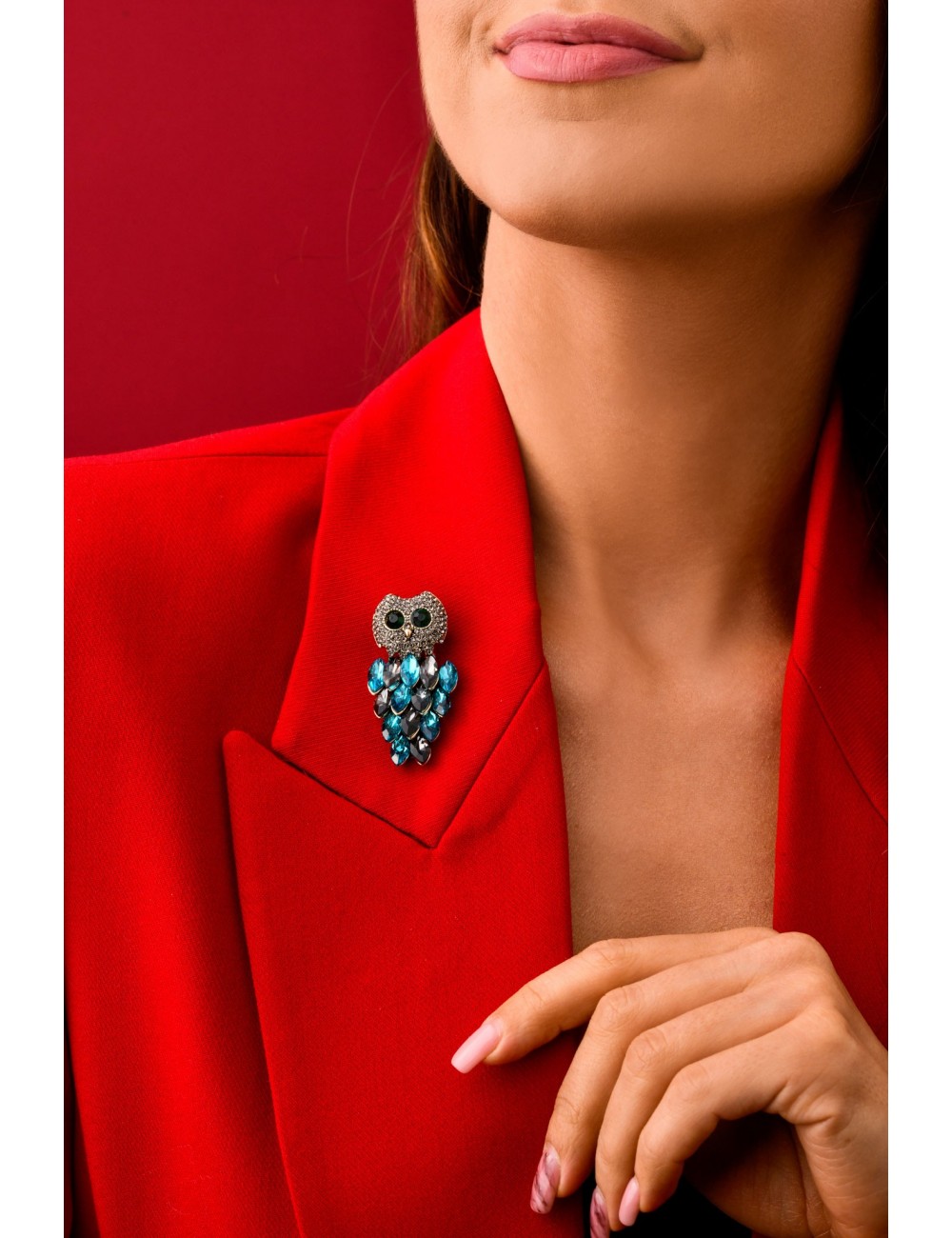 Krásná kovová brož ve tvaru sovy posetá skleněnými krystaly.