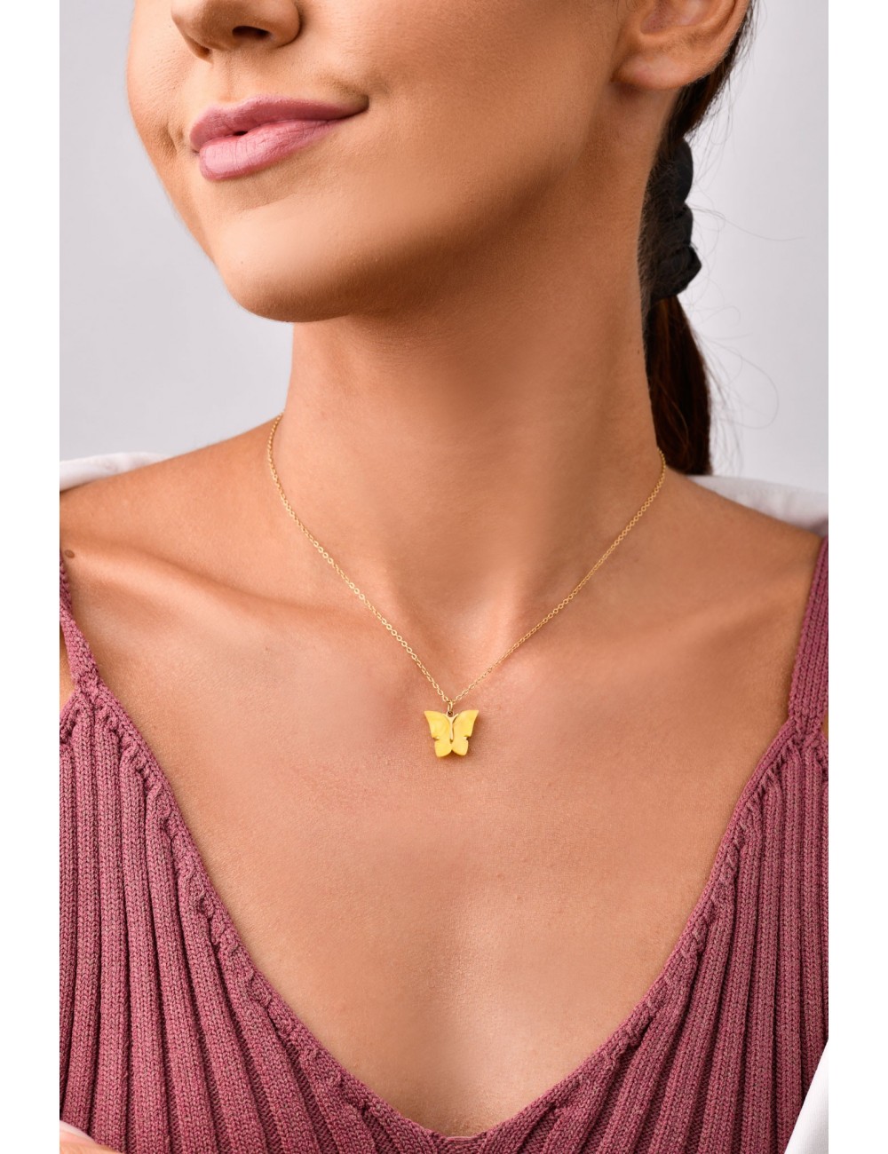 Zlatý řetízek z chirurgické oceli s přívěskem motýlka ve žluté barvě o velikosti 1,3 x 1.5 cm. Délka řetízku 40 cm s možností regulace 5 cm.