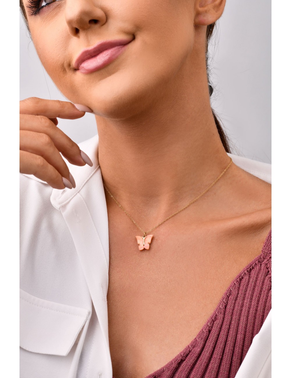 Zlatý řetízek z chirurgické oceli s přívěskem motýlka v oranžové barvě o velikosti 1,3 x 1.5 cm. Délka řetízku 40 cm s možností regulace 5 cm.