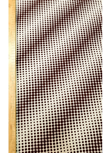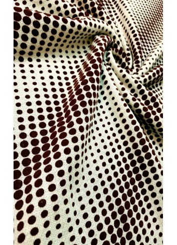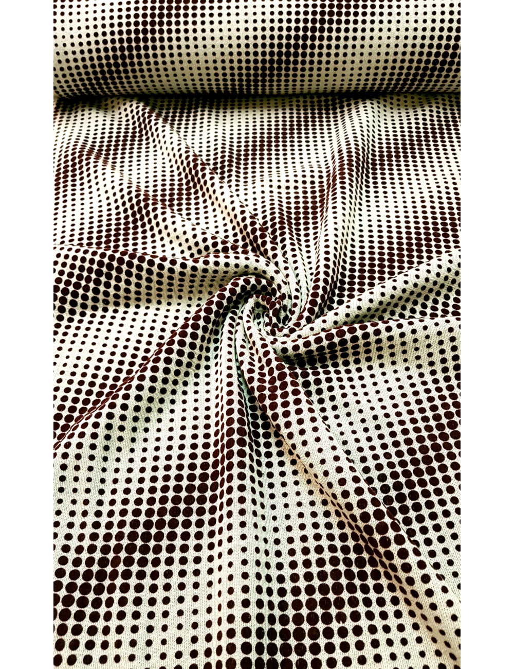 Vzorovaný elastický bavlněný úplet, teplákovina nepočesaná v supreme kvalitě Oeko-tex standard 100, světově uznávané záruky kvality pro textil. Puntíkatý sametový vzor ( provedeno metodou flokování ) v tmavě červené barvě na ivory základu. Příjemná na dotek, elastická, super gramáž 320 gr ! Vyrobeno v Itálii.