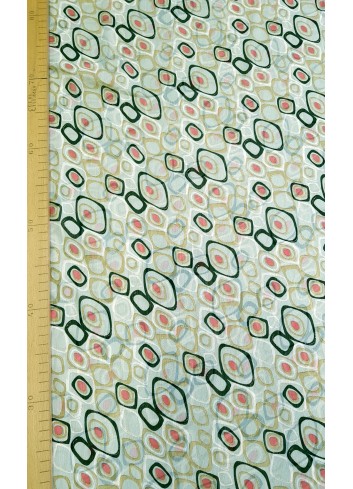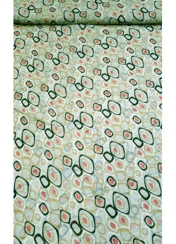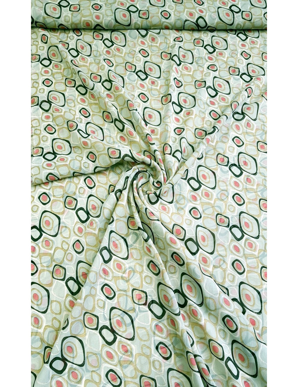 Šifón s geometrickým vzorem na šedém základu, decentně protkávaný zlatou nitkou, splývavý krásný materiál, lehoučký, vzdušný a příjemný na dotek.