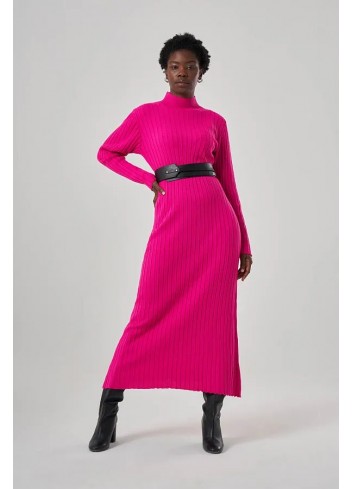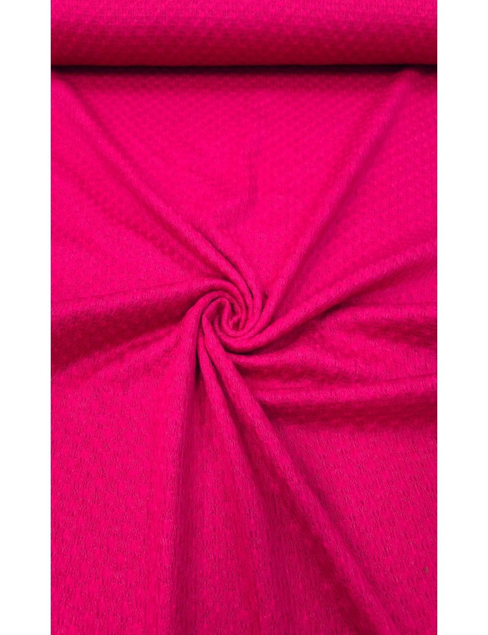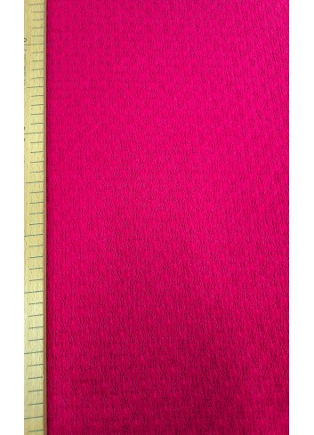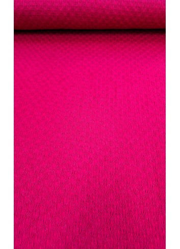 Svetříkový úplet střední gramáže v tmavší fuchsiové barvě. Příjemný na nošení, teplý, nekousavý, měkký, elastický a nekrčivý. Možno kombinovat i oboustranně, z rubové strany je krajka ve shodné fuchsiové barvbě.