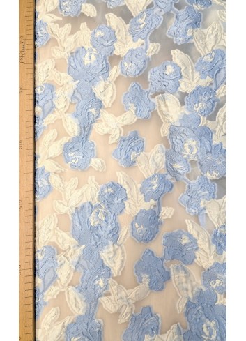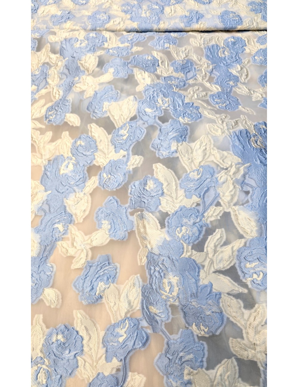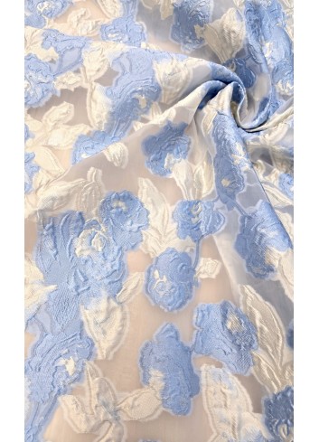 Krásný žakár na organze, velice efektní látka s devoré efektem s mladistvým modrým květinovým vystouplým vzorem, krásný materiál, lehoučký, vzdušný a příjemný na dotek.