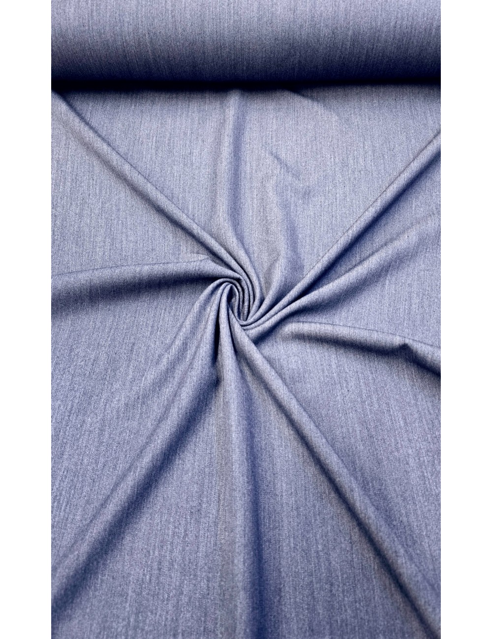 Italská elastická látka, kostýmovka šatovka v světlejší modré melanži, připomínající džínovinu s vysokým obsahem přírodních vláken, tudíž krásně splývavá, příjemná na nošení, mírně elastická, málo se krčí, elegantní vzhled, perfektní gramáž a kvalita.