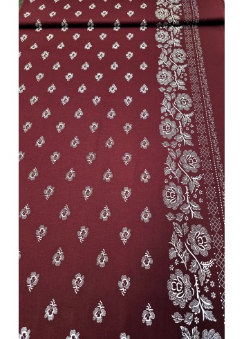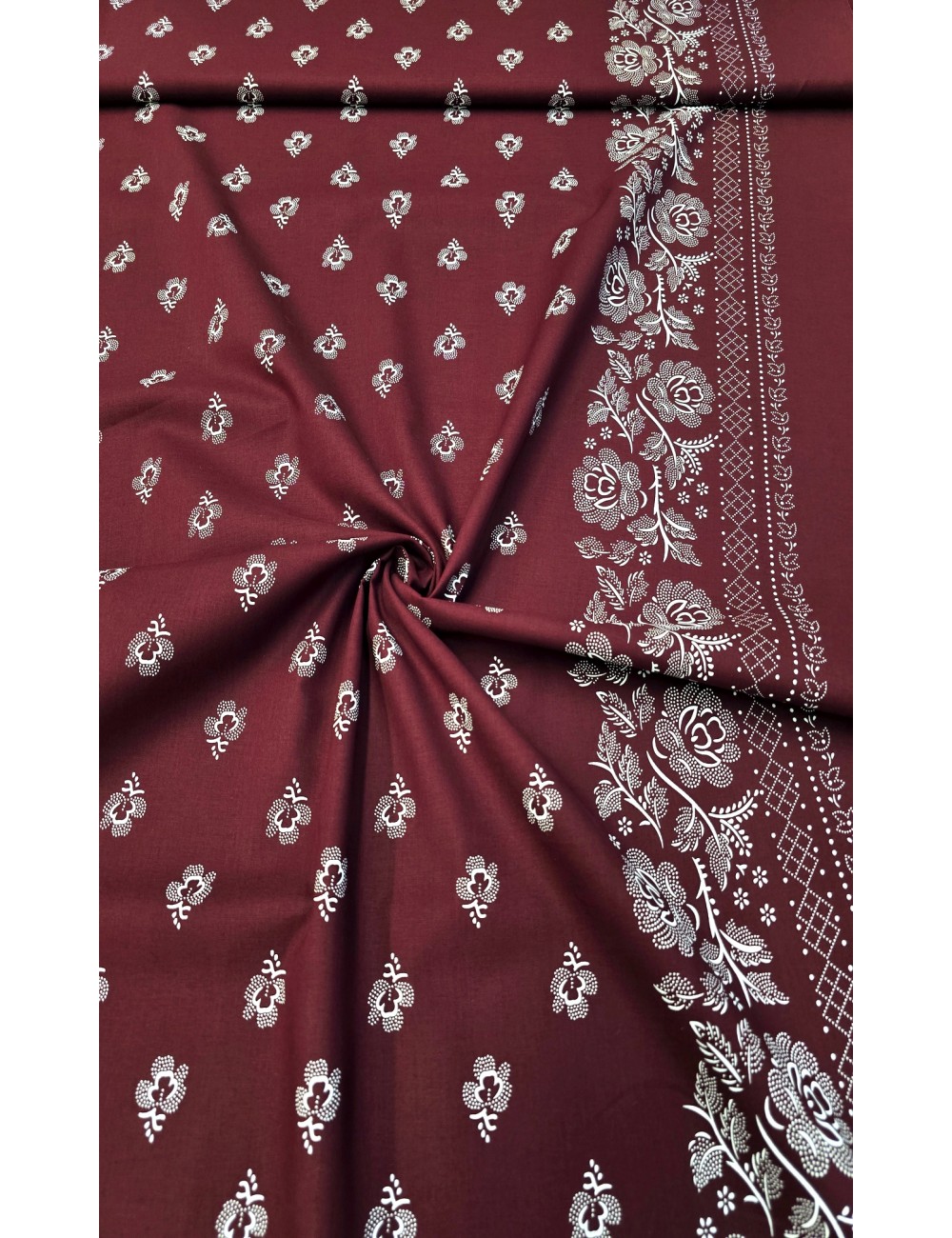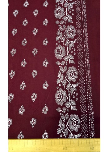 Elastický bavlněný popelín, příjemný a splývavý, mírně elastický, nádherná bílá květinová jednostranná bordura o šíři 15 cm a vzorem drobných bílých kvítků po celé ploše látky na bordó základu. Vyrobeno v Itálii.