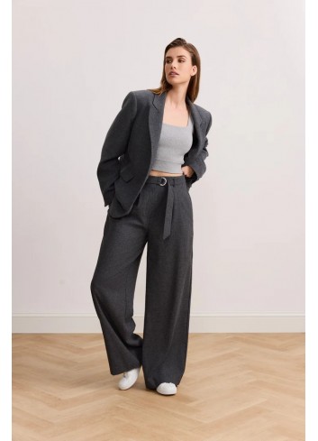 Lehká kostýmovka v tmavě šedé barvě, střední gramáže, splývavá, příjemná na nošení, elastická vazbou, elegantní vzhled s decentním tlumeným leskem na lícové straně.