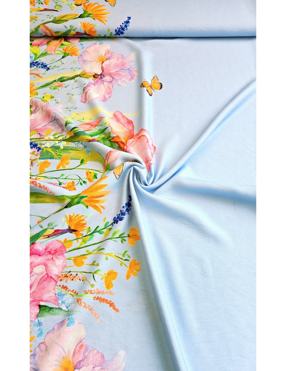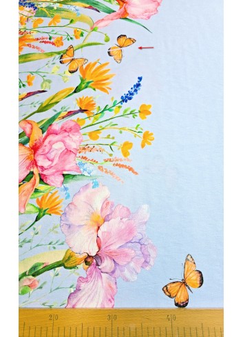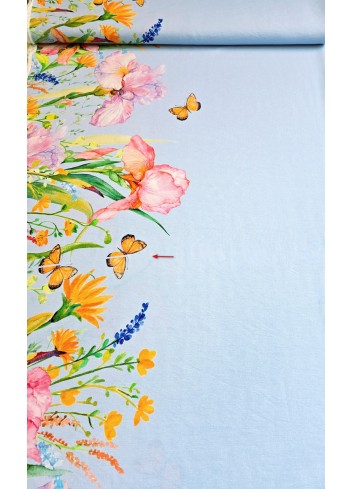 Krásná látka z italské produkce, oboustranná bordura o šíři 45 cm, květinový vzor s motýlky. Viskóza ve směsi se lnem, lehounká látka, splývavá, neprůsvitná a mírně elastická, vynikající gramáž. Vyrobeno v Itálii, top kvalita, vynikající volba na letní outfity.