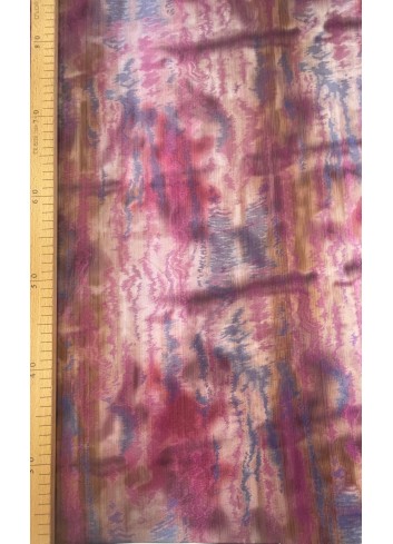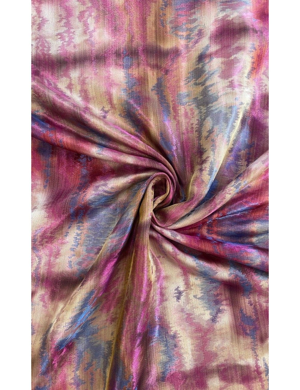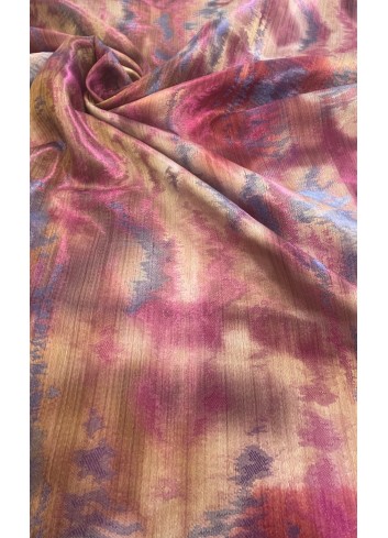 Krásný žakárový vzor v duhovém provedení v odstínech fuchsiové , modré a zemitých tónech . Materiál střední gramáže, splývavý , lehce tuhý , pružný diagonálně . Vyrobeno v Italii .