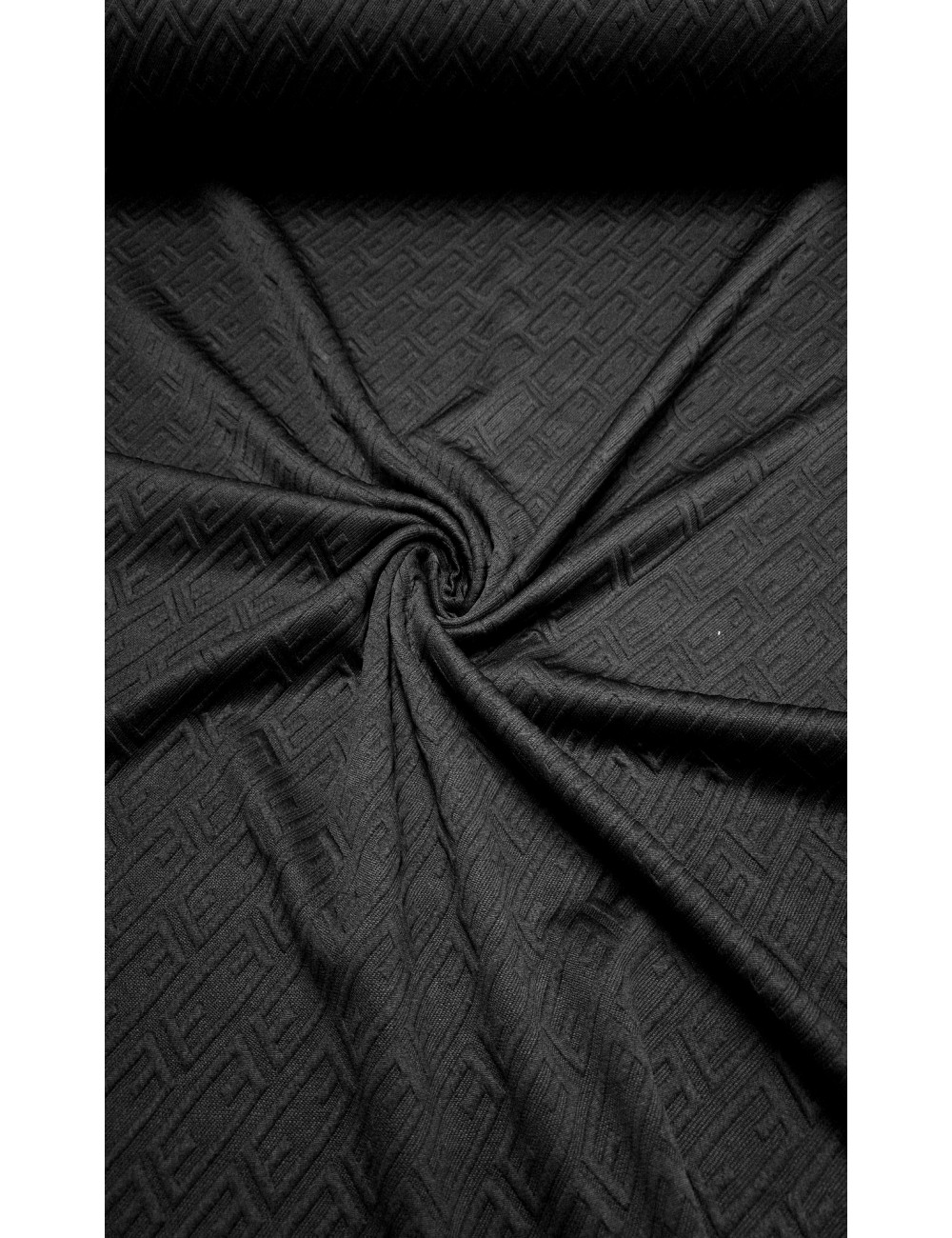 Kvalitní italský úplet v černé barvě s vystouplým geometrickým vzorem. Příjemný na nošení, nekousavý, měkký, elastický, splývavý a nekrčivý, super šíře. Vynikající poměr kvality a ceny.