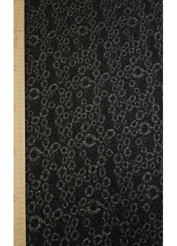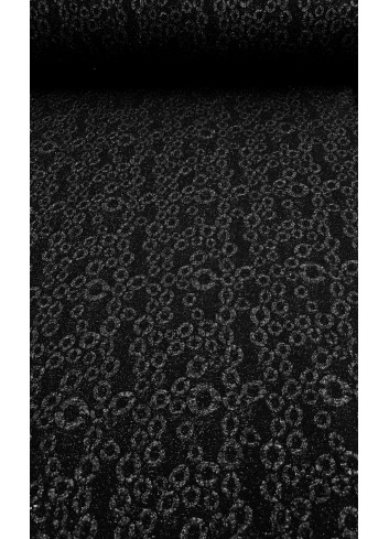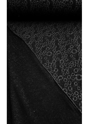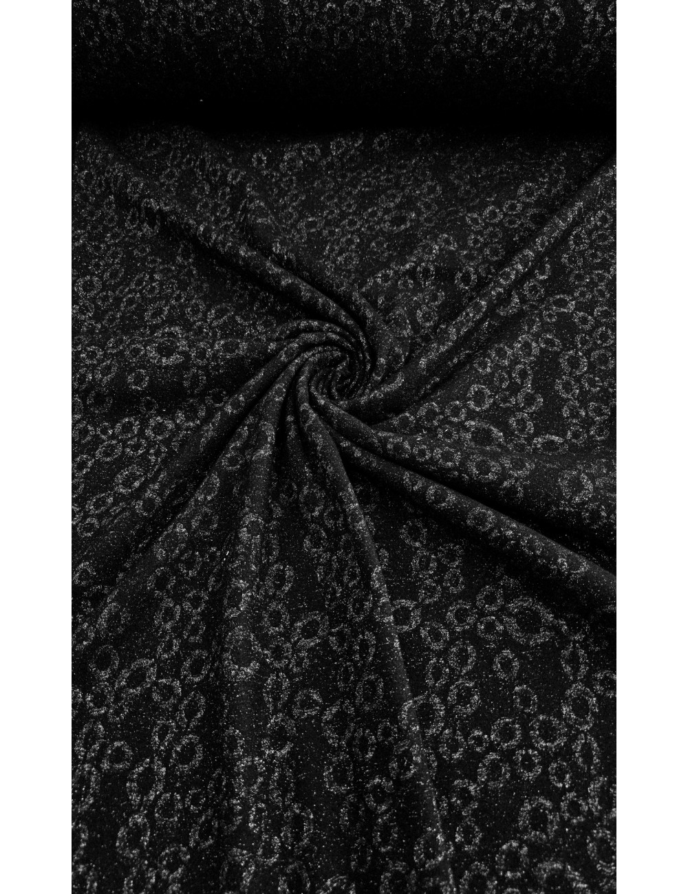 Kvalitní italský tenší svetříkový úplet v černé barvě se sříbrným vetkávaným lurexovým kroužkovým geometrickým vzorem. Příjemný na nošení, nekousavý, měkký, elastický, splývavý a nekrčivý. Vynikající poměr kvality a ceny.