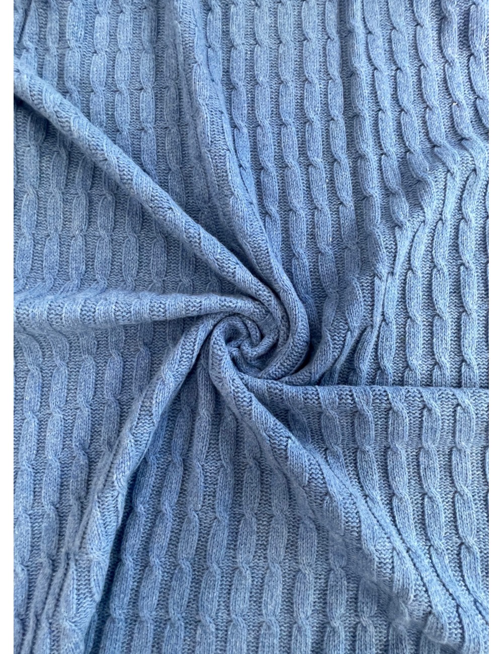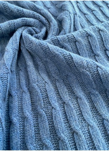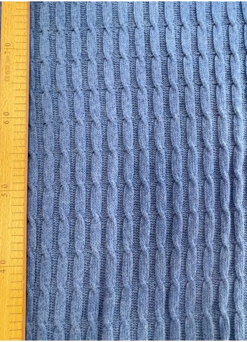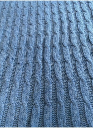 Luxusní svetříkový vlněný copánkový úplet větší gramáže v chrpově modré barvě. Příjemný na nošení, hřejivý, nekousavý, měkký, elastický a nekrčivý. Vyrobeno v Itálii z přírodních vláken s vysokým podílem virgine vlny. Super gramáž!