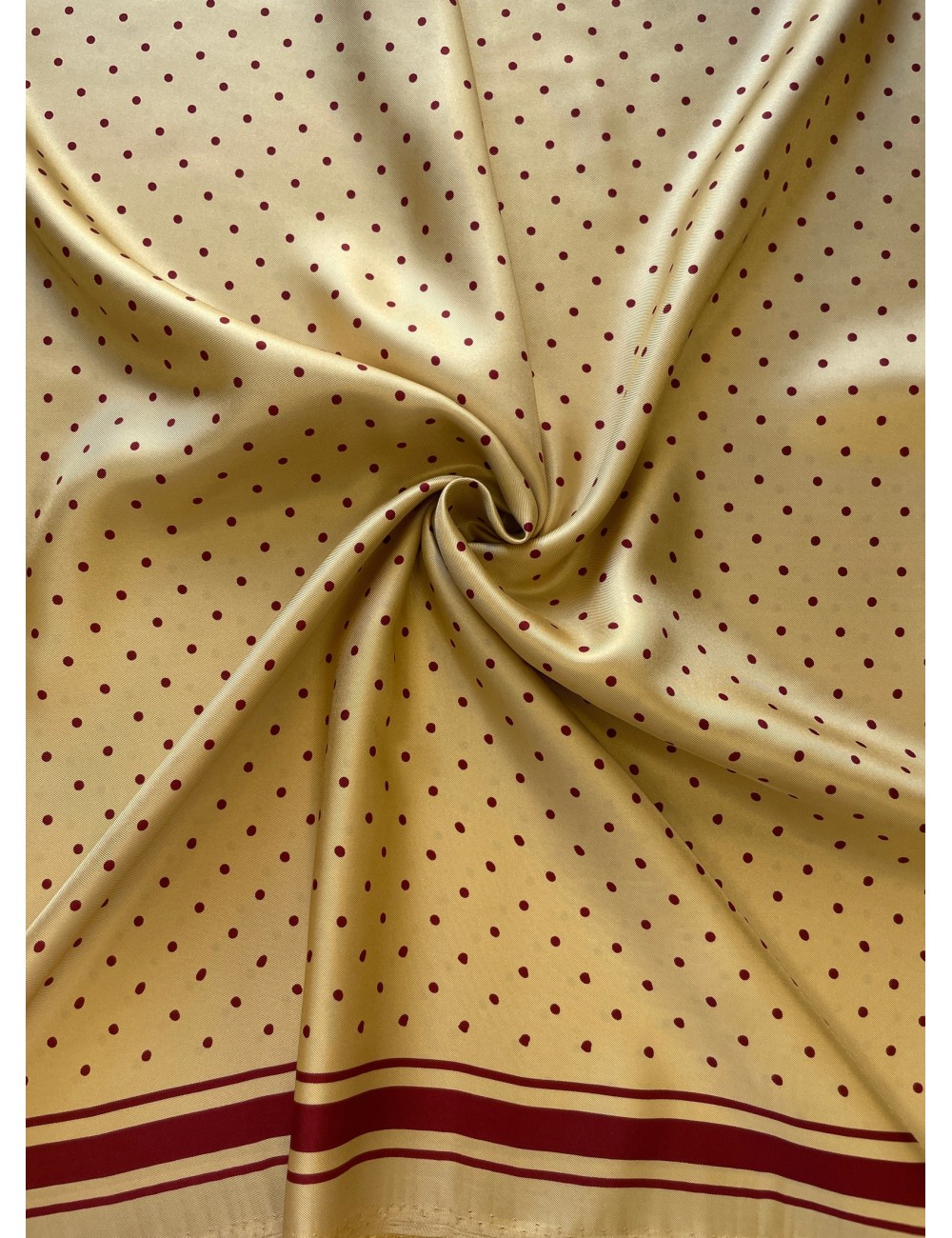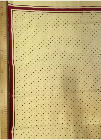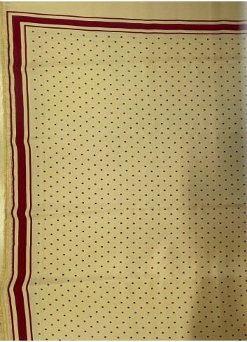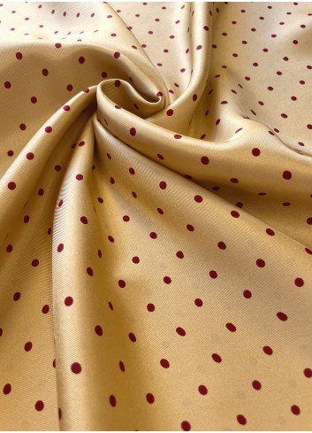 Krásné saténové hedvábné panely velikosti 140 x 140 cm v medové barvě s vínově červenými puntíky . Neprůsvitné, lehounké a splývavé ve větší gramáži s nadčasovým vzorem.