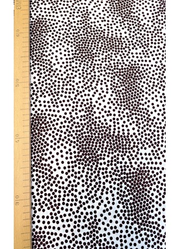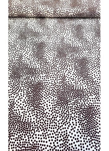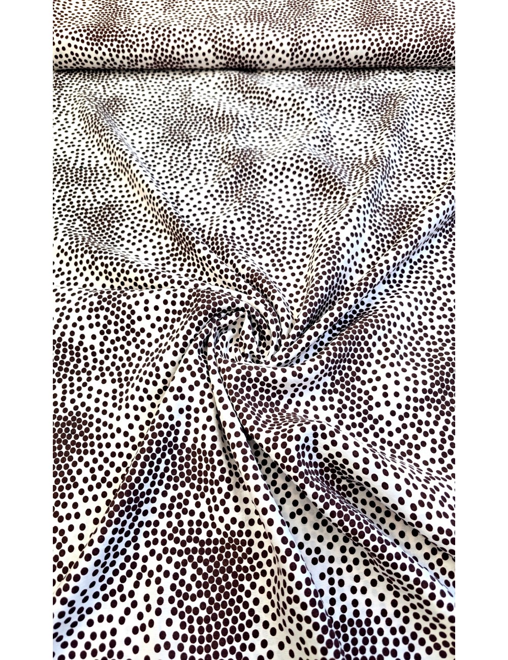 Krásná látka z italské produkce, drobné nepravidelně rozmístěné hnědé puntíčky na ivory základu. Viskóza ve směsi s hedvábím, lehounká látka, splývavá, neprůsvitná a mírně elastická, super gramáž. Vyrobeno v Itálii, top kvalita.