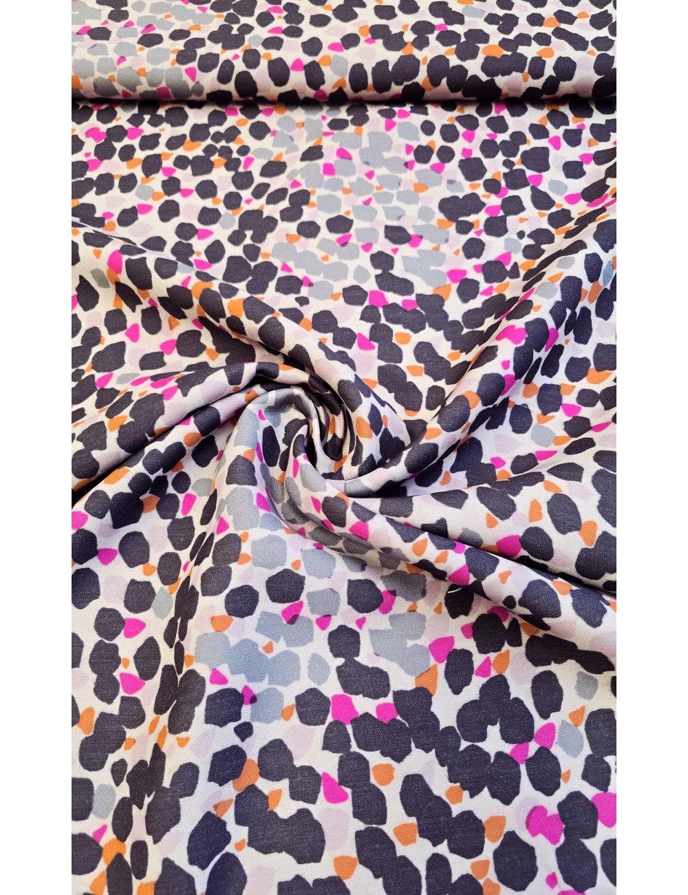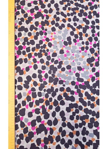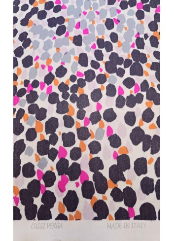 Luxusní vlněná kostýmovka ve směsi s hedvábím s barevným abstraktním vzorem na šedém základu ve střední gramáži, pevná, ale příjemná na nošení, neocenitelná schopnost držet teplotu, nemačká se, elastická vazbou.  Vyrobeno v Itálii výrobcem luxusních látek LUIGI VERGA , tato společnost má více jak 80-letou tradici  a je jedním z nejvýznamnějších dodavatelů kvalitních látek současnosti.