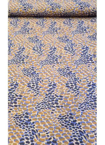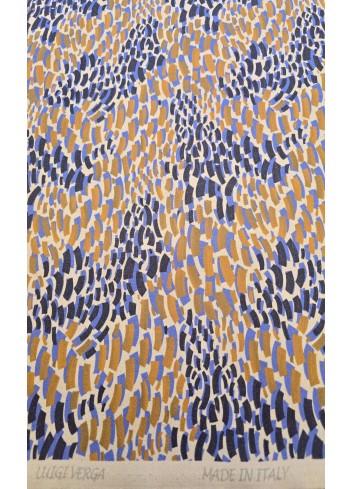 Luxusní vlněná kostýmovka ve směsi s hedvábím s barevným abstraktním vzorem na béžovém základu ve střední gramáži, pevná, ale příjemná na nošení, neocenitelná schopnost držet teplotu, nemačká se, elastická vazbou. Vyrobeno v Itálii výrobcem luxusních látek LUIGI VERGA , tato společnost má více jak 80-letou tradici a je jedním z nejvýznamnějších dodavatelů kvalitních látek současnosti.