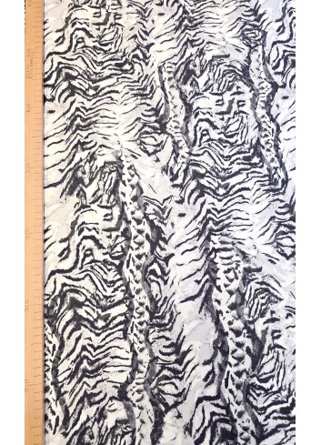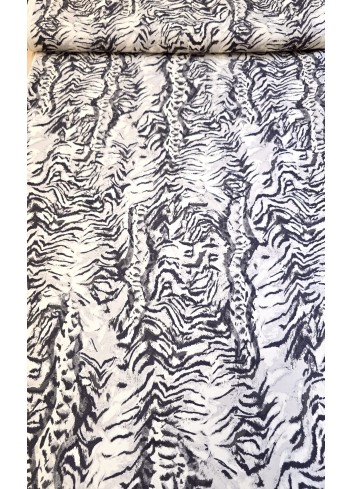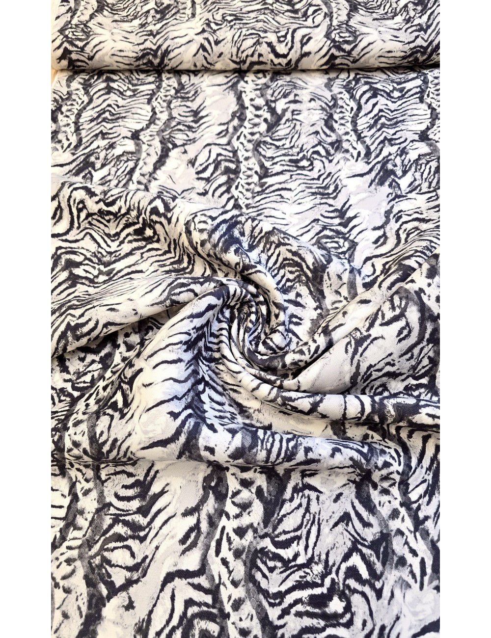 Luxusní vlněná kostýmovka ve směsi s hedvábím s animal vzorem na ivory základu ve větší gramáži, pevná, ale příjemná na nošení, neocenitelná schopnost držet teplotu, nemačká se, elastická vazbou. Vyrobeno v Itálii výrobcem luxusních látek LUIGI VERGA , tato společnost má více jak 80-letou tradici  a je jedním z nejvýznamnějších dodavatelů kvalitních látek současnosti.