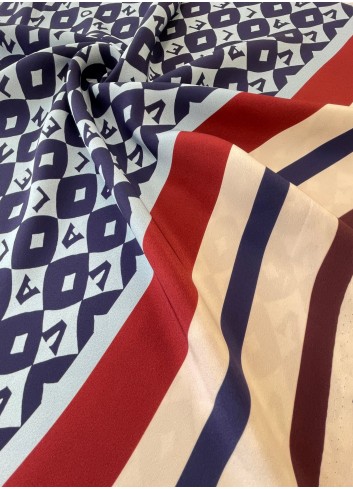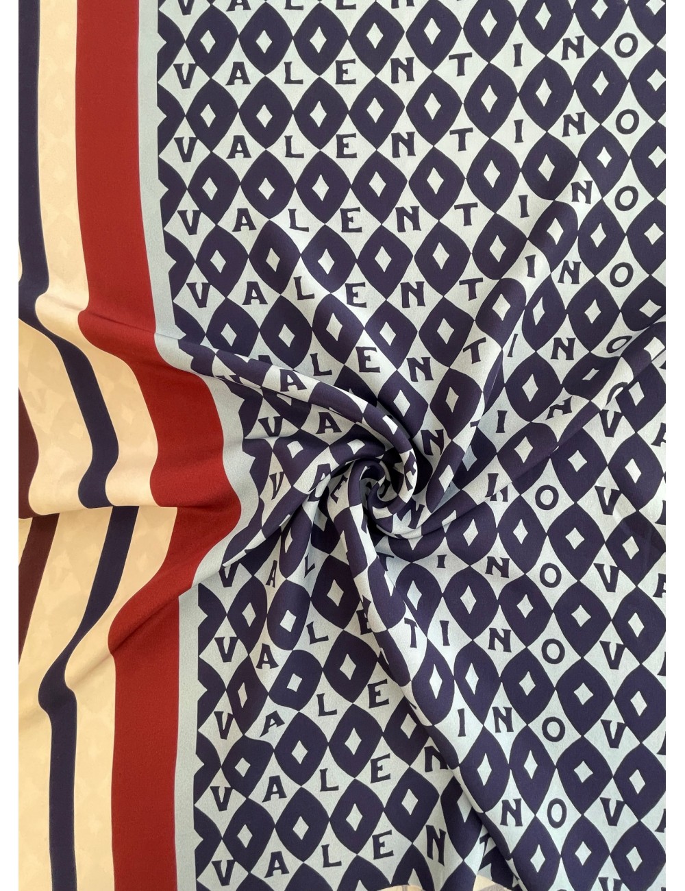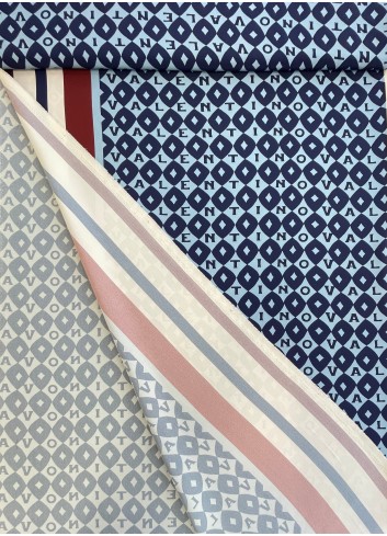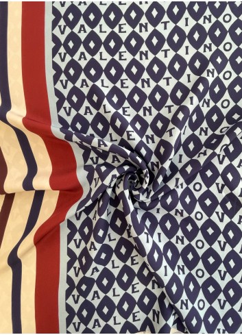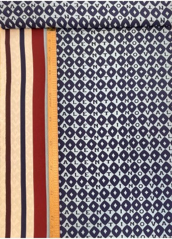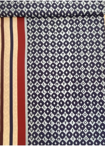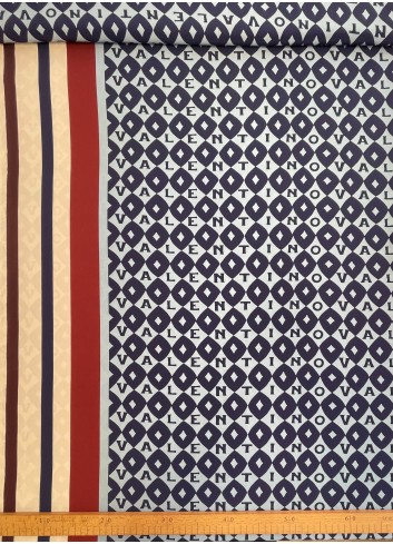 Italské luxusní žoržetové hedvábí ve stylu módní značky Valentino s jednostrannou pruhovanou bordurou v odstínech bordó a ivory v šíři cca 17cm a signovaném tmavěmodrém VALENTINO na světlemodrém podkladu v šíři 123 cm . Neprůsvitné, lehounké a splývavé. Vyrobeno v Itálii.