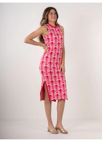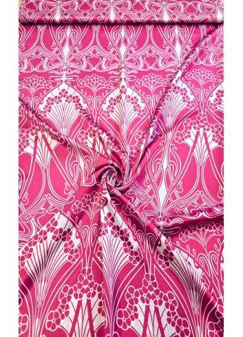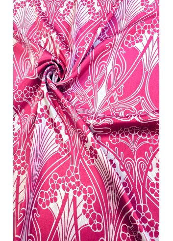 Luxusní italské saténové hedvábí střední gramáže s květinovo abstraktním vzorem v světle fuchsiovém provedení na bílém základu, neprůsvitné, lehounké a splývavé.