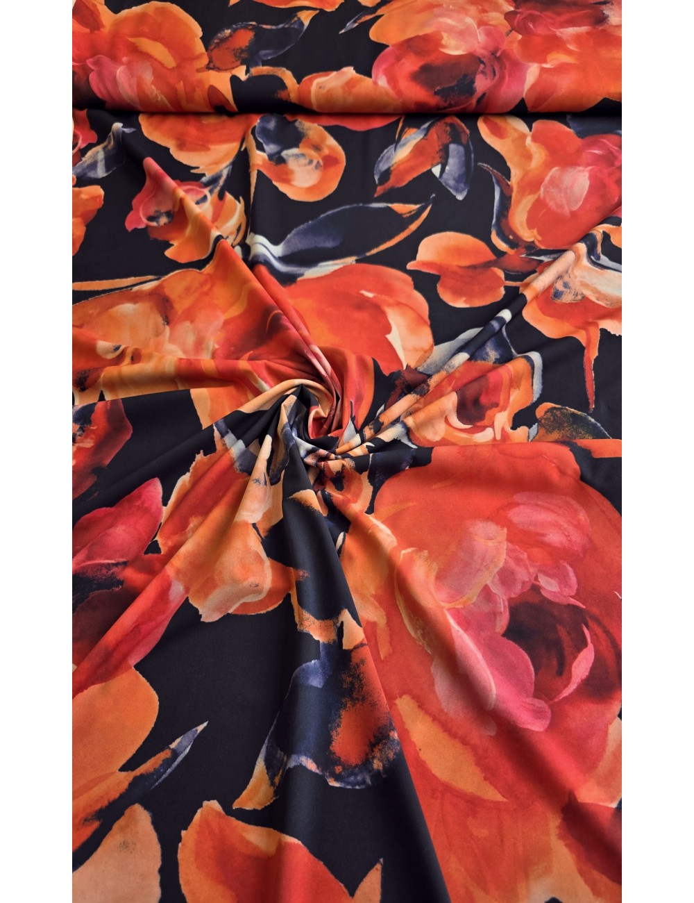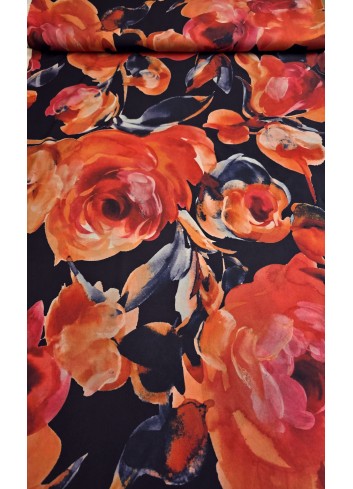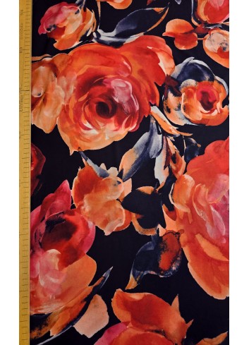 Vzorovaná látka, šatovka s velkými červenými květy na tmavě modrém základu, elastická oběma směry, lehounká, příjemná, splývavá, téměř neprůsvitná, rychleschnoucí a málo krčivá.
