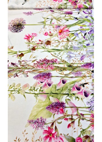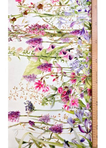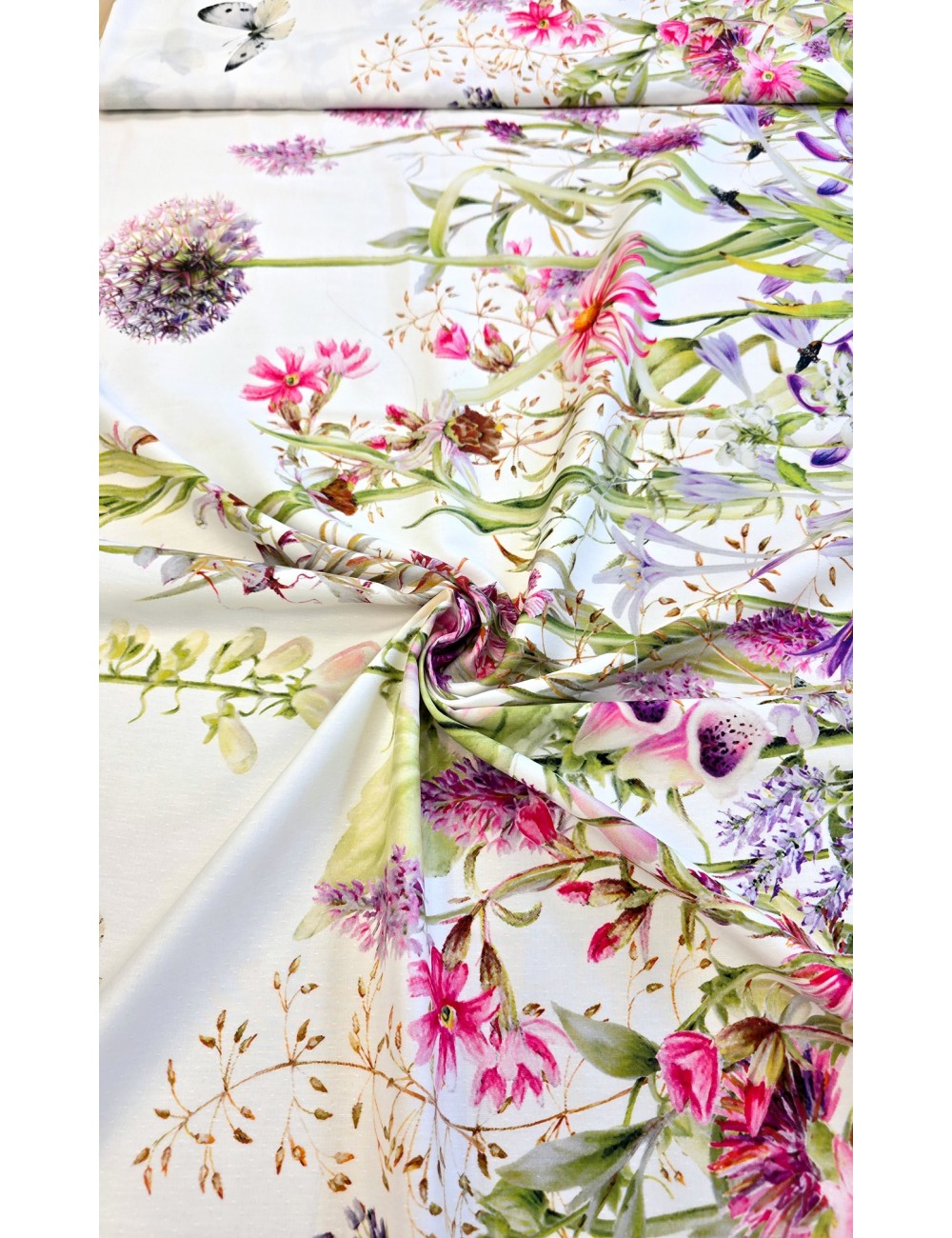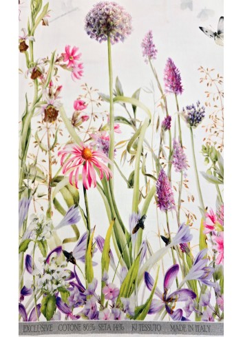 Krásný italský bavlněný voál ve směsi s hedvábím a vetkávanými droboučkými puntíčky, lehounký a příjemný na nošení, vzor jednostranná květinová bordura o šíři 95 cm. Téměř neprůsvitný, vzdušný, splývavý, mírně elastický vazbou, dobrá gramáž, top kvalita. Vyrobeno v Itálii.
