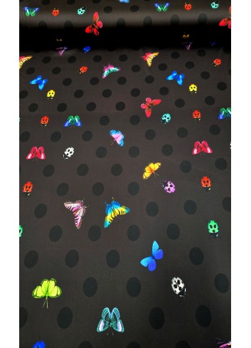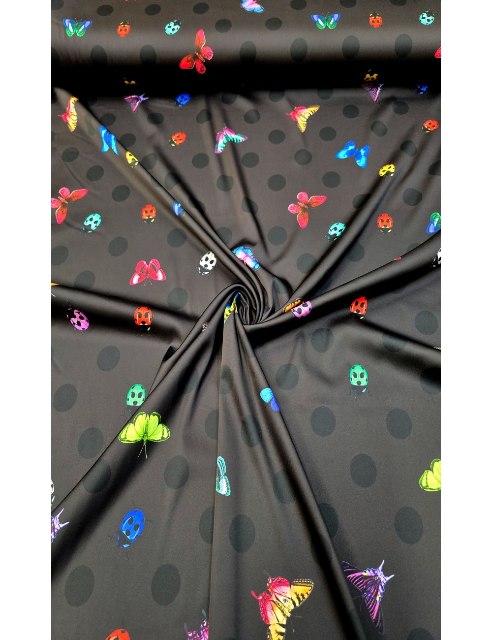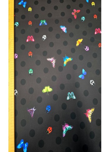 Krásná splývavá italská látka, směsové hedvábí s černými puntíky, beruškami a motýlky na temně hnědém základu ve stylu módní značky VERSACE, kolekce DUA LIPA. Lehoučká, splývavá, příjemná na dotek s luxusním tlumeným leskem ve směsi s hedvábím. Vyrobeno v Itálii.