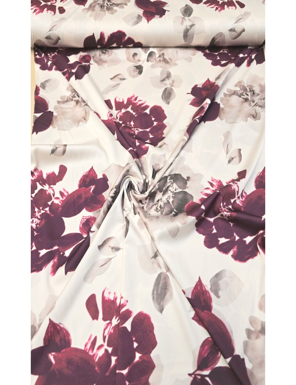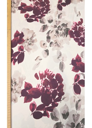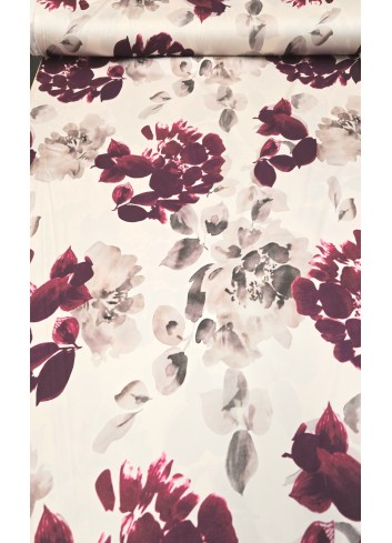 Krásná splývavá italská látka s květovaným vzorem v bordó barvě na ivory základu. Lehoučká a elastická, příjemná na dotek s luxusním tlumeným leskem ve směsi s hedvábím. Vyrobeno v Itálii.