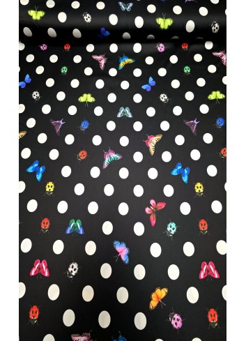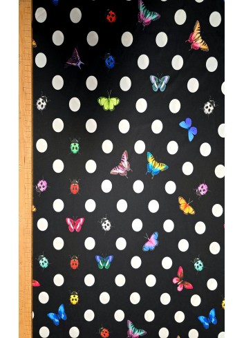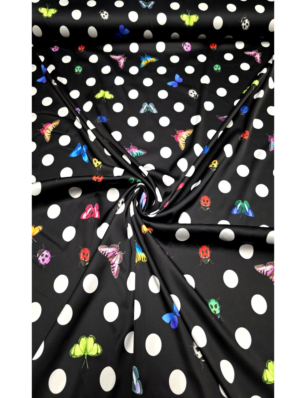 Krásná splývavá italská látka, směsové hedvábí s puntíky, beruškami a motýlky na černém základu ve stylu módní značky VERSACE, kolekce DUA LIPA. Lehoučká, splývavá, příjemná na dotek s luxusním tlumeným leskem ve směsi s hedvábím. Vyrobeno v Itálii.