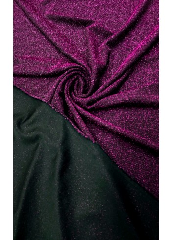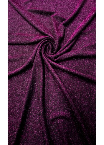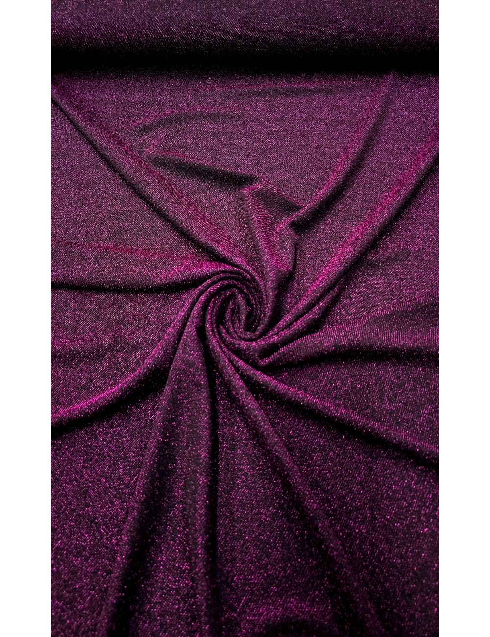 Středně silný elastický úplet s vetkávaným lurexovým vláknem v magenta barvě na lícové straně, splývavý a velmi příjemný na dotek, neprůhledný a elastický. Velice efektní společenský materiál.