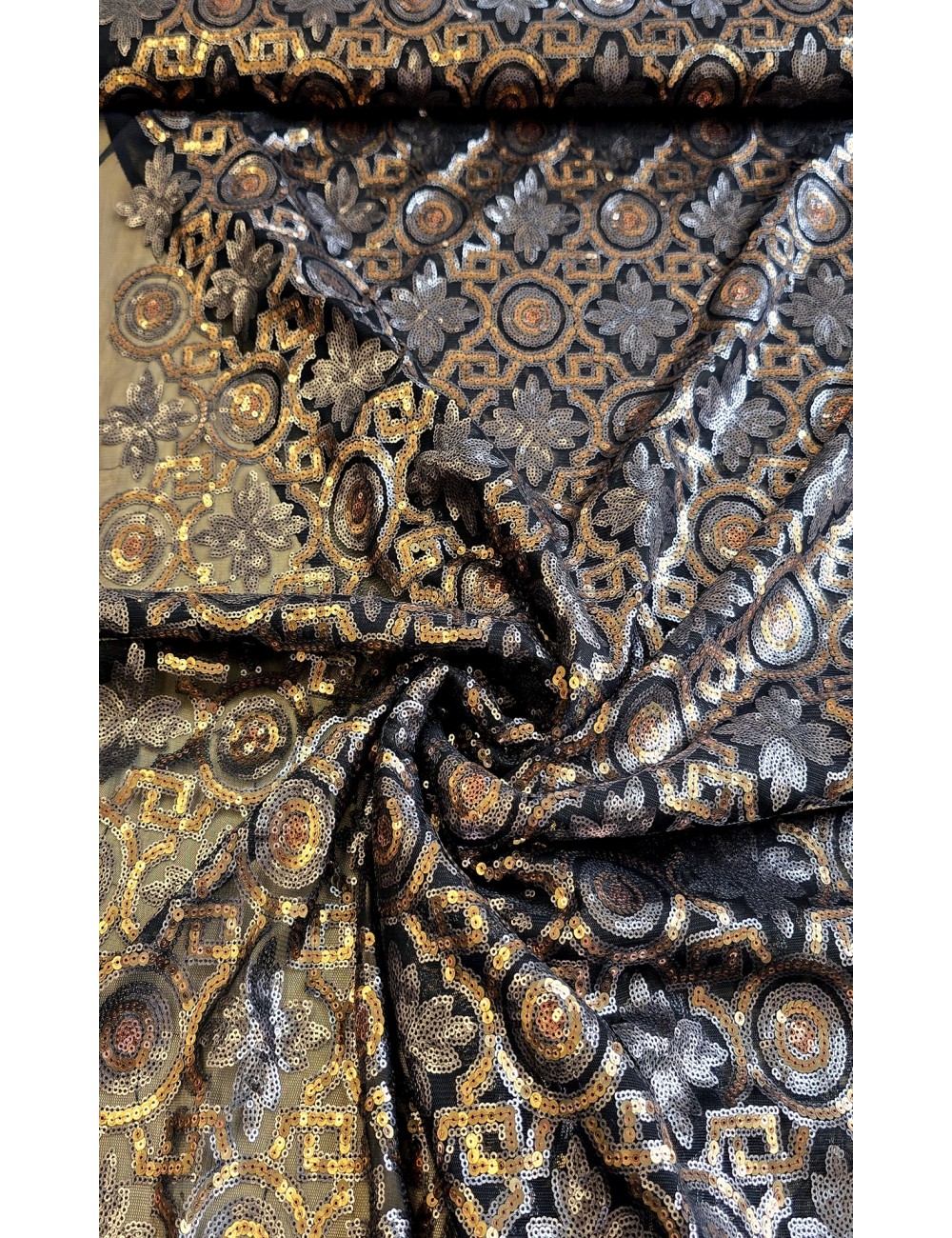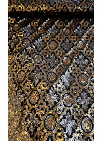 Velice efektní flitrová látka s geometrickým vzorem ve zlato stříbrném provedení. Vyšívaná na elastickém černém tylu, krásná společenská látka. Vyrobeno v Itálii.