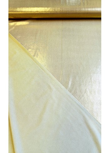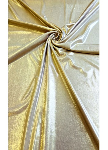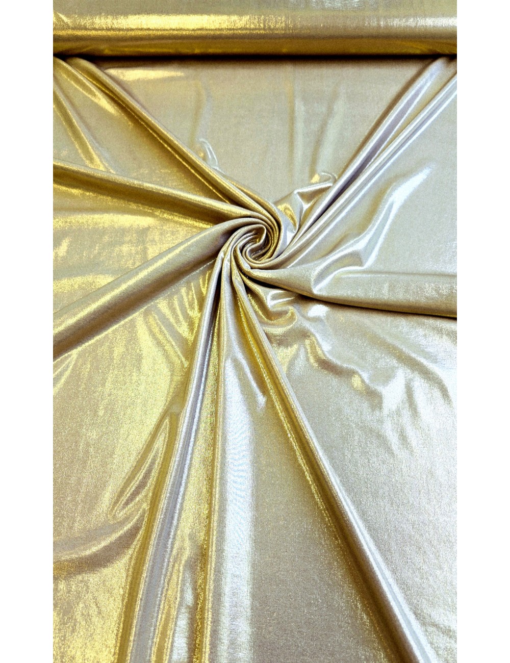 Krásný italský splývavý společenský úplet se zlatým metalickým efektem a zlato béžovou barvou na rubové straně. Neprůsvitný, splývavý, příjemný na dotek, efektní lesk, elastický.
